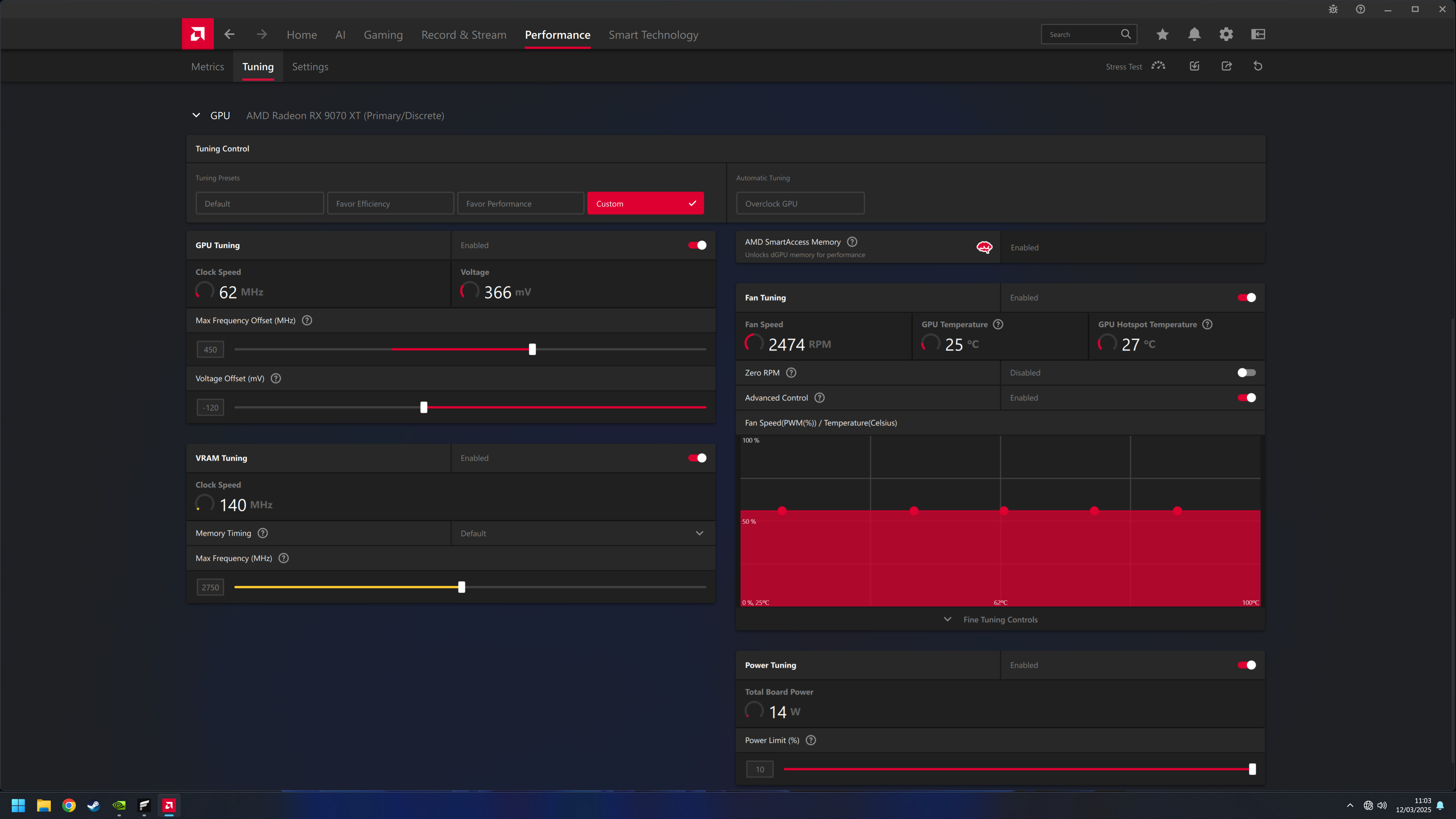 Overclocking the RX 9070 XT is very similar to the RX 7000 series, in the sense that the overclocking bit itself doesn't really matter, but it all depends on how far you can lower voltage. For the Nitro+, I maximised the power limit at +10%, added 450MHz to the GPU clock, set the memory clock to a maximum of 2750MHz, and managed to set a -120mV offset.