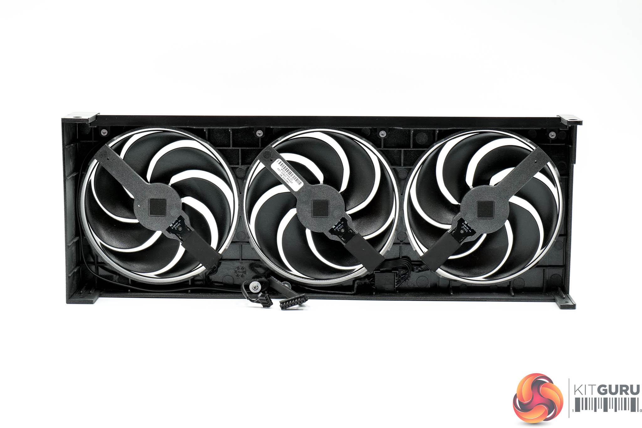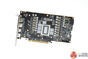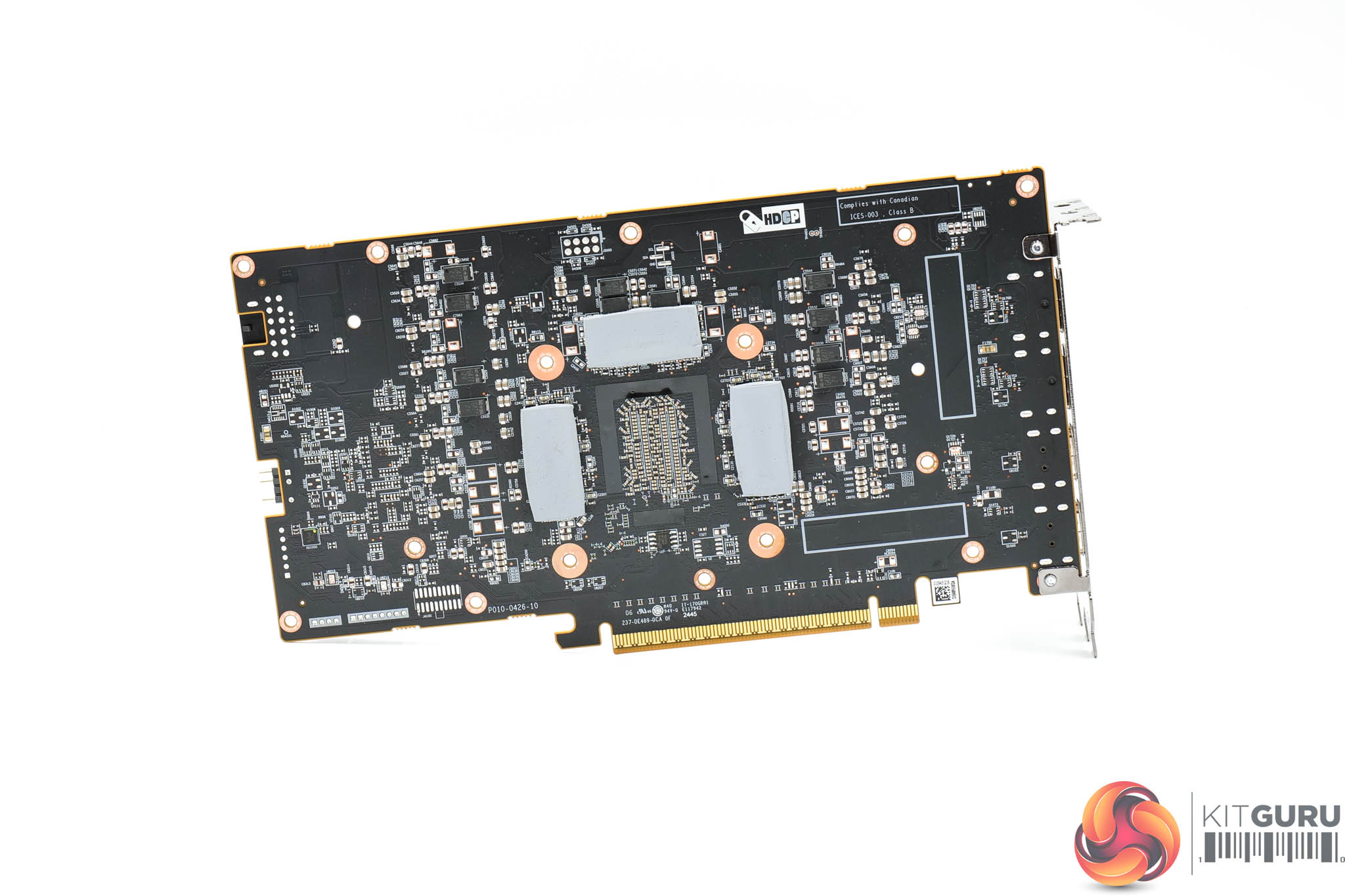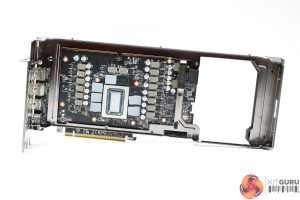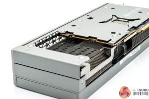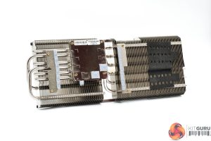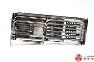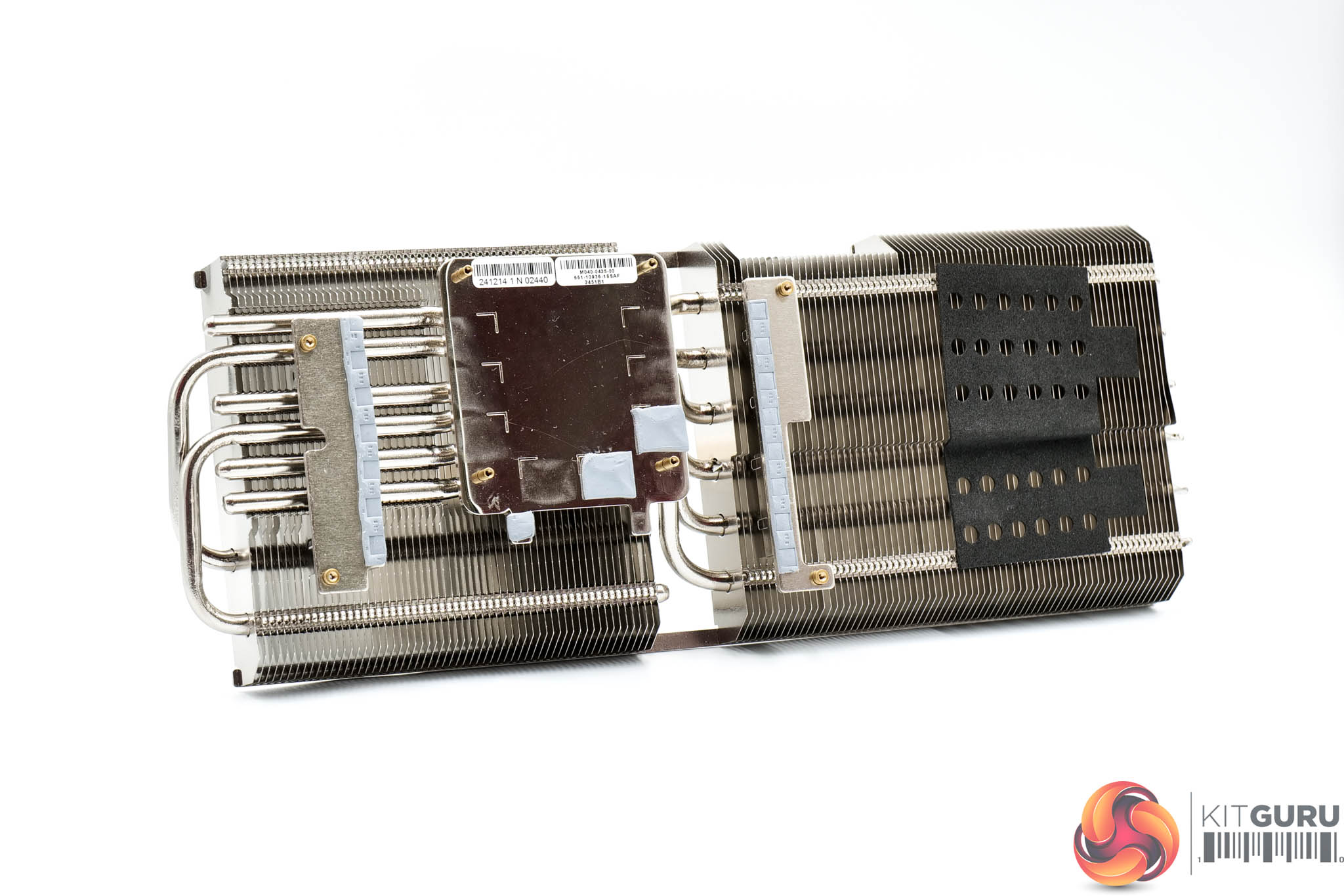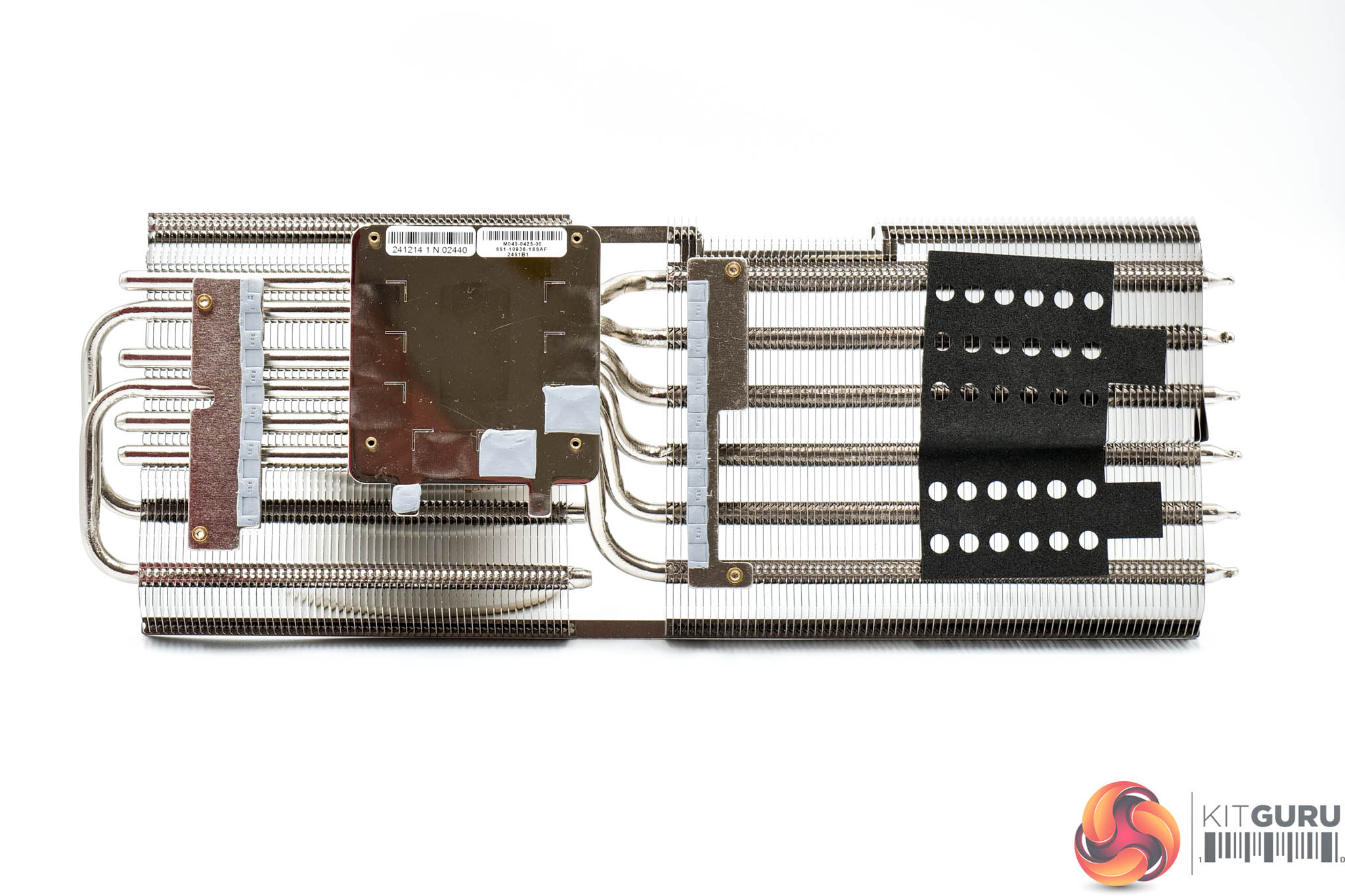The heatsink utilises six heatpipes, with the GPU and VRAM contacting with a central baseplate. Smaller secondary plates are used to contact the VRM.
