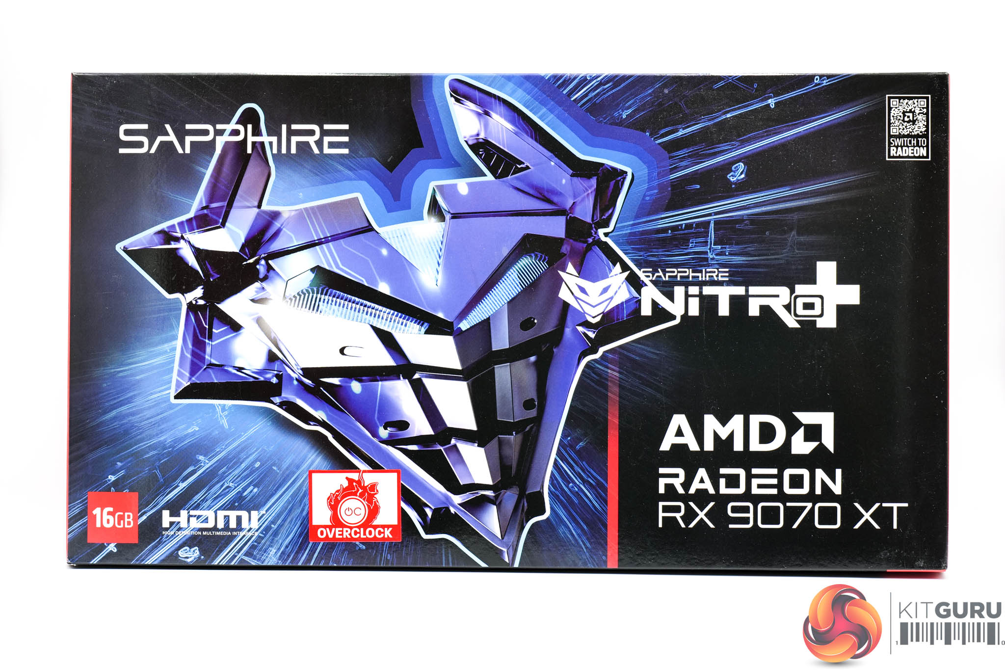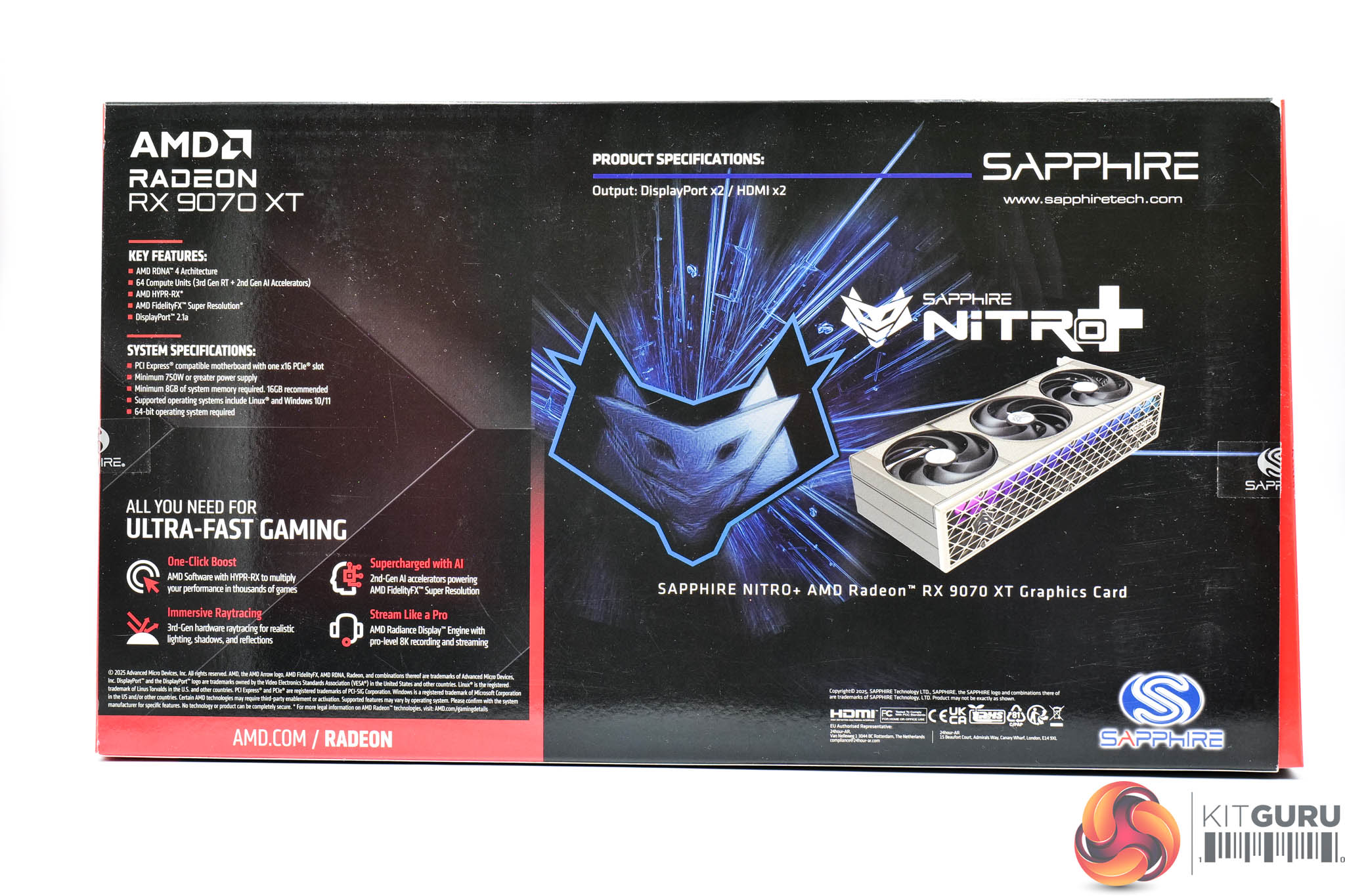 The Sapphire RX 9070 XT Nitro+ ships in a colourful box, with a large Nitro logo on the front, alongside the AMD branding. On the back, Sapphire highlights several key features of the card and RDNA 4 architecture.
