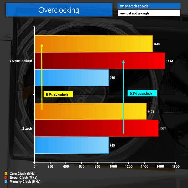 These parameters gave an added 80MHz or so in the real world, with the boost frequency settling at about 1662MHz – up from 1577MHz at stock settings.