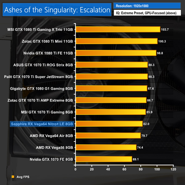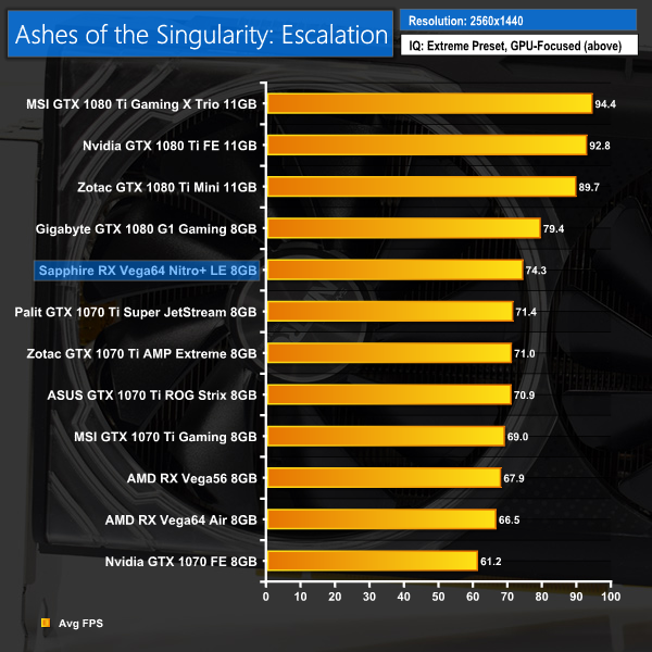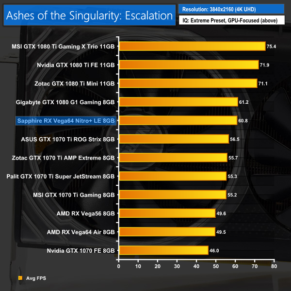 It is when testing Ashes, particularly at 1440p and 4K, that we really see the Nitro+ card really stretch its legs – at both of those resolutions, the Sapphire card delivers at least 8 more frames on average than reference Vega 64.