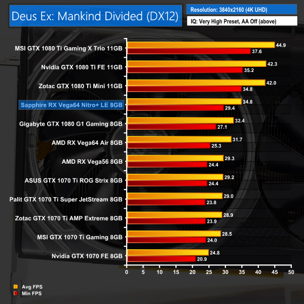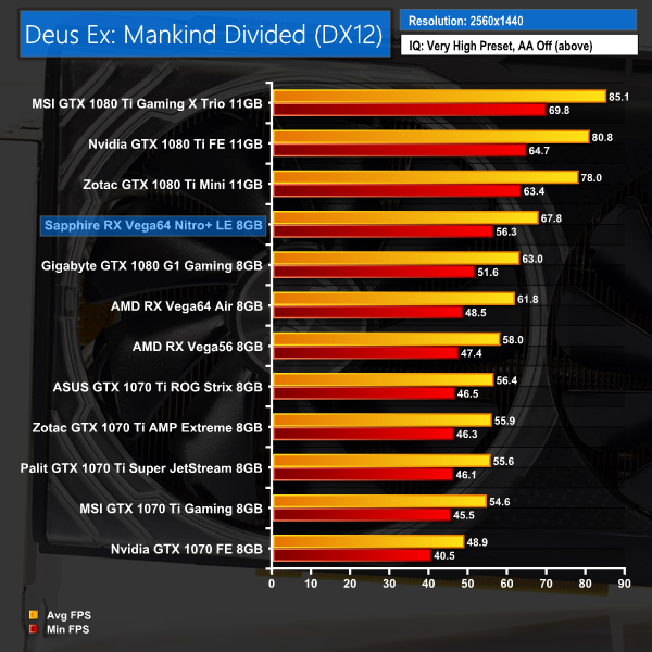 Deus Ex has always favoured AMD hardware, so it is no surprise to see the Nitro+ perform brilliantly in this test. At 1080p, the Sapphire card delivered an extra 7 FPS on average when compared to the reference card – not bad at all.
