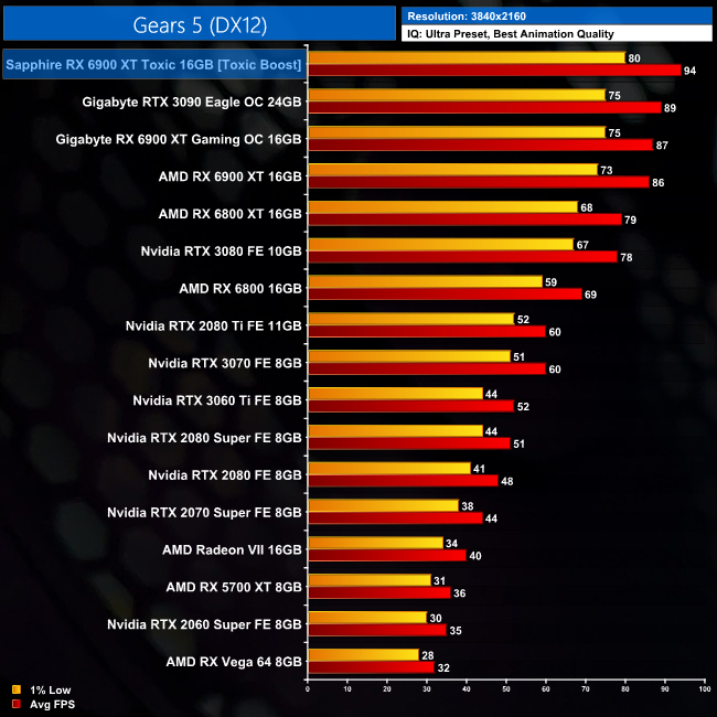 Gears 5 is another AMD title, but at 4K we can see the reference 6900 XT is still 3% slower than the RTX 3090. Thanks to the Toxic's increased clock speed, it comes in 6% faster than the 3090.