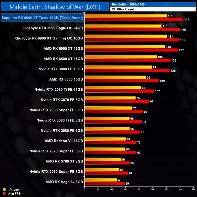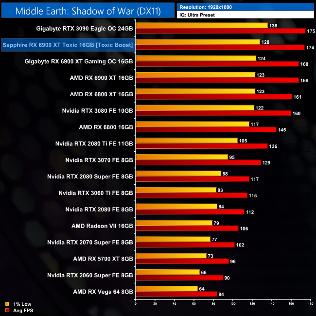 Shadow of War doesn't scale as well as some of the other games we've tested, with the Toxic outperforming AMD's reference 6900 XT by 7% at 4K. That puts it just 5% slower than the RTX 3090.