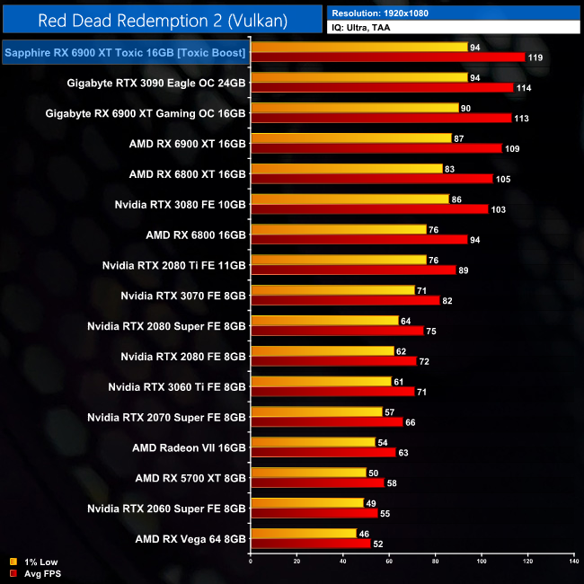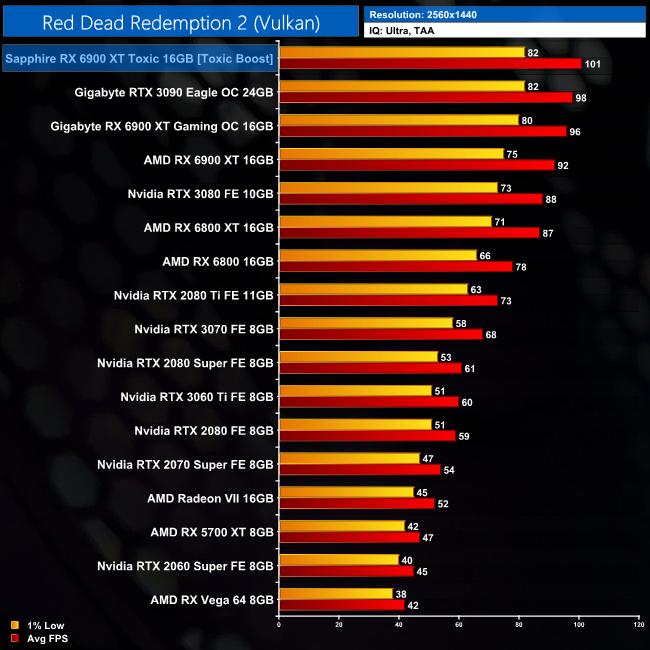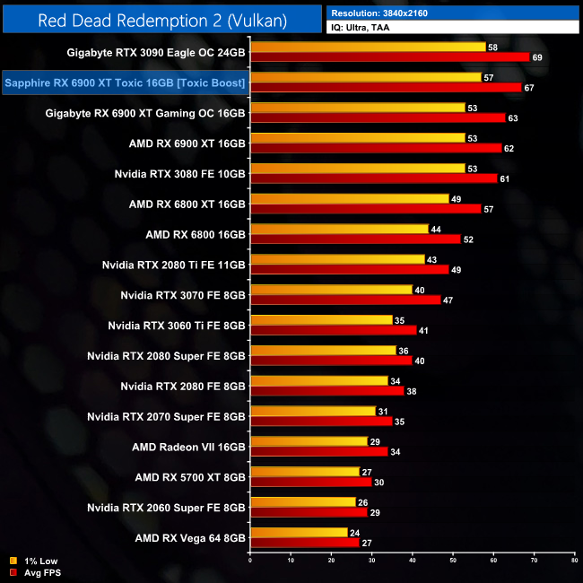 Red Dead Redemption 2 meanwhile, sees the Toxic fall just 3% behind the RTX 3090 at 4K. It's 5 FPS, or 8% faster, than AMD's reference card in this title.