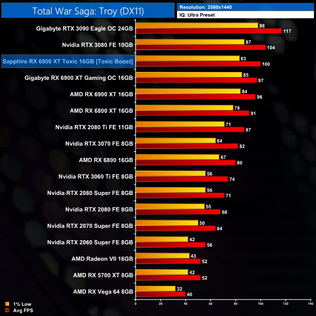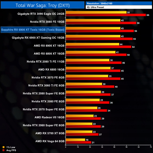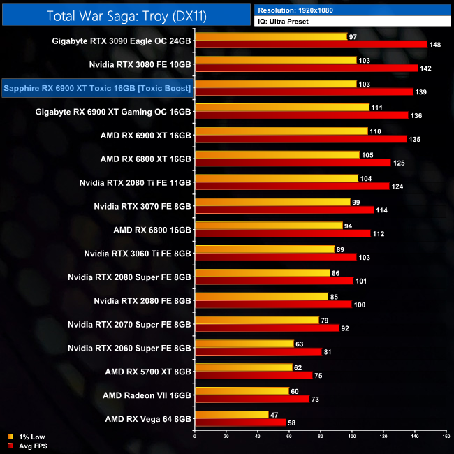 As for Total War Saga: Troy, this is actually the game where we see the 6900 XT perform at its worst, relatively speaking, when compared to the RTX 3090. The Toxic is 15% slower than the RTX 3090 here, so it's a significant margin. The Toxic is also just 4% slower than the reference card, so the added clock speed doesn't make much difference in this title.