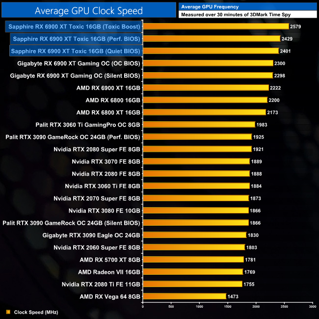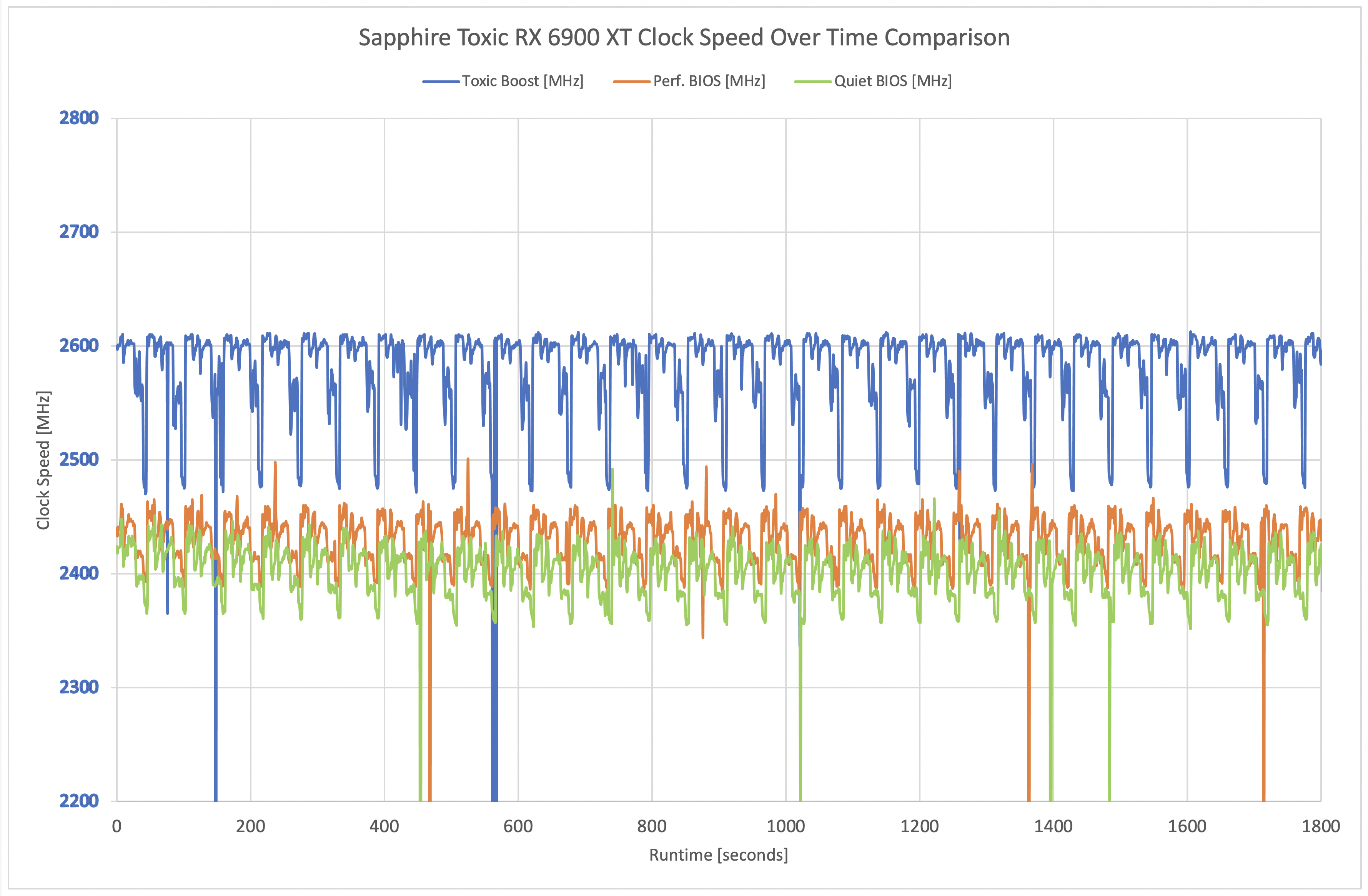 Looking at the Toxic's clock speed while testing Toxic Boost, the Performance BIOS and the Quiet BIOS, we can see a clear advantage to Toxic Boost in that it operates the core at a significantly higher frequency. Both the Quiet and Performance BIOS are still faster than the reference 6900 XT, and even Gigabyte's Gaming OC, but Toxic Boost brings average clock speed to nearly 2600MHz, which is highly impressive.