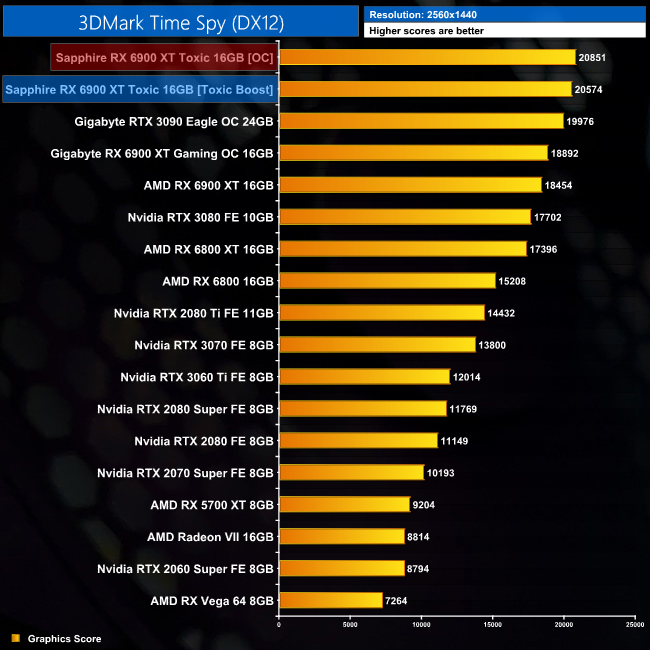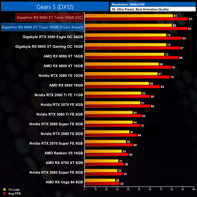 This manual overclock barely delivered any extra performance compared to Toxic Boost. In fact, with just a 2FPS difference in F1 2020, and then an improvement of just a single frame for Gears 5 and Watch Dogs: Legion, I'd say there is no actual difference with this overclock applied.