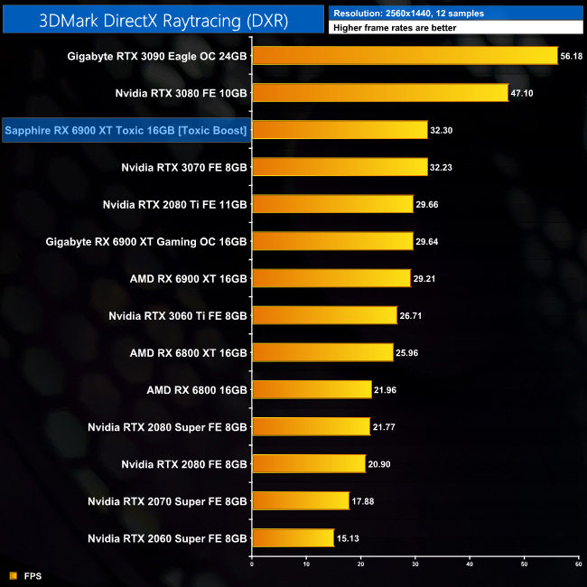 Ray tracing is an area where Nvidia has the upper hand, and we can see that in the 3DMark DXR feature test. Despite outperforming the reference 6900 XT by 11%, the Toxic is still 43% slower than the RTX 3090 and 31% slower than RTX 3080.