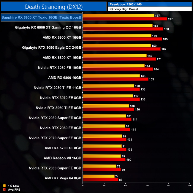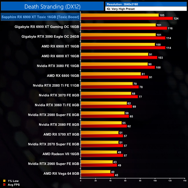 While Death Stranding isn't an AMD-sponsored title, Team Red does well in this game and that is on show here. The Toxic comes in 9% ahead of both AMD's reference 6900 XT and RTX 3090 when testing at 4K.