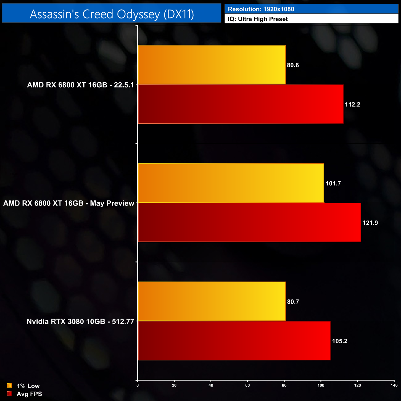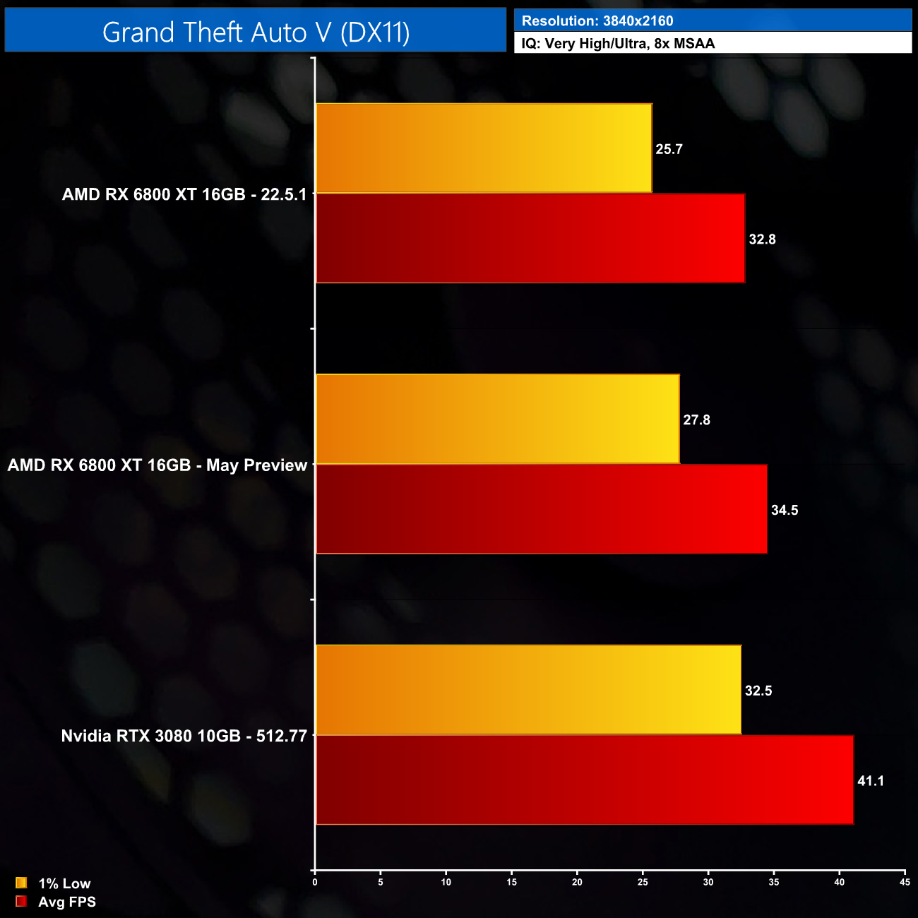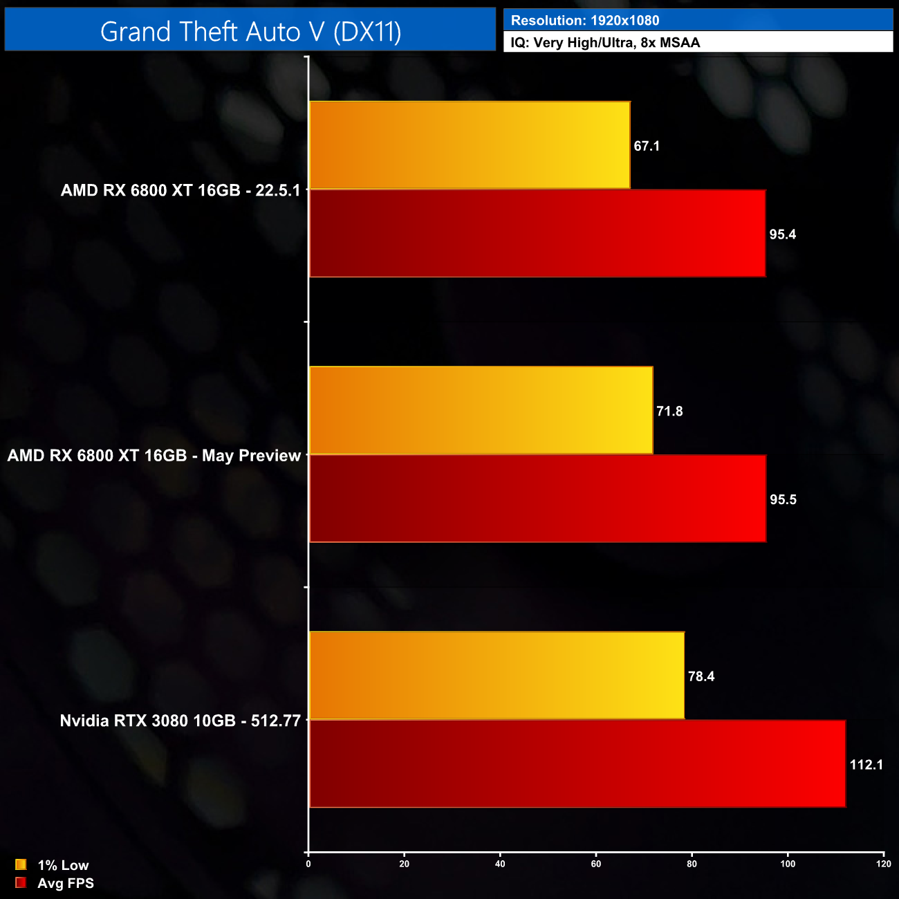 Next up we have a big one – GTA V, still one of the most popular games on steam almost a decade after it’s release. Here we again see next to no chance in the average frame rate for the 6800 XT when using the Preview driver. The 1% lows do improve by 5% at 1440p, but it’s not exactly a game changer, particularly as the RTX 3080 has a clear lead to begin with.