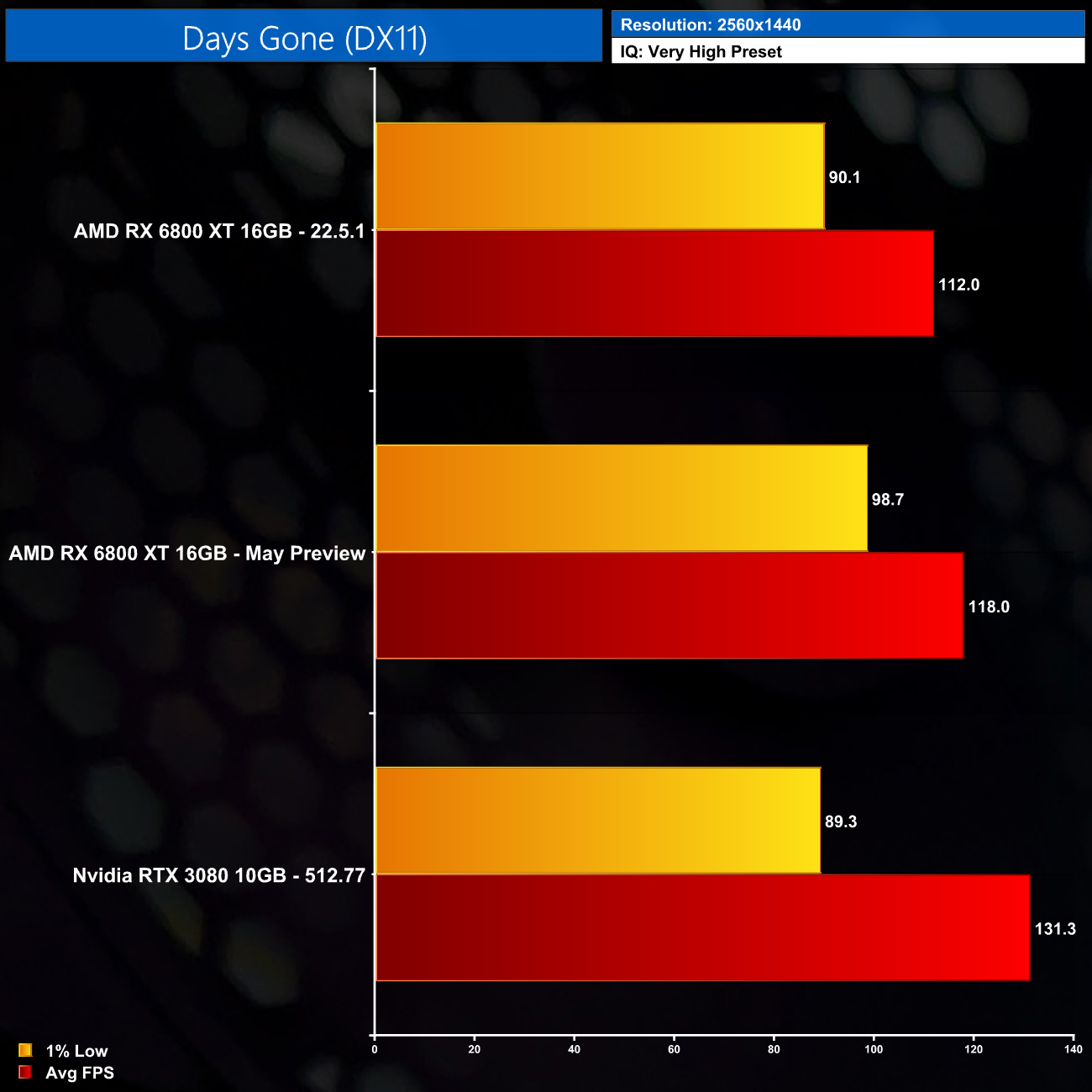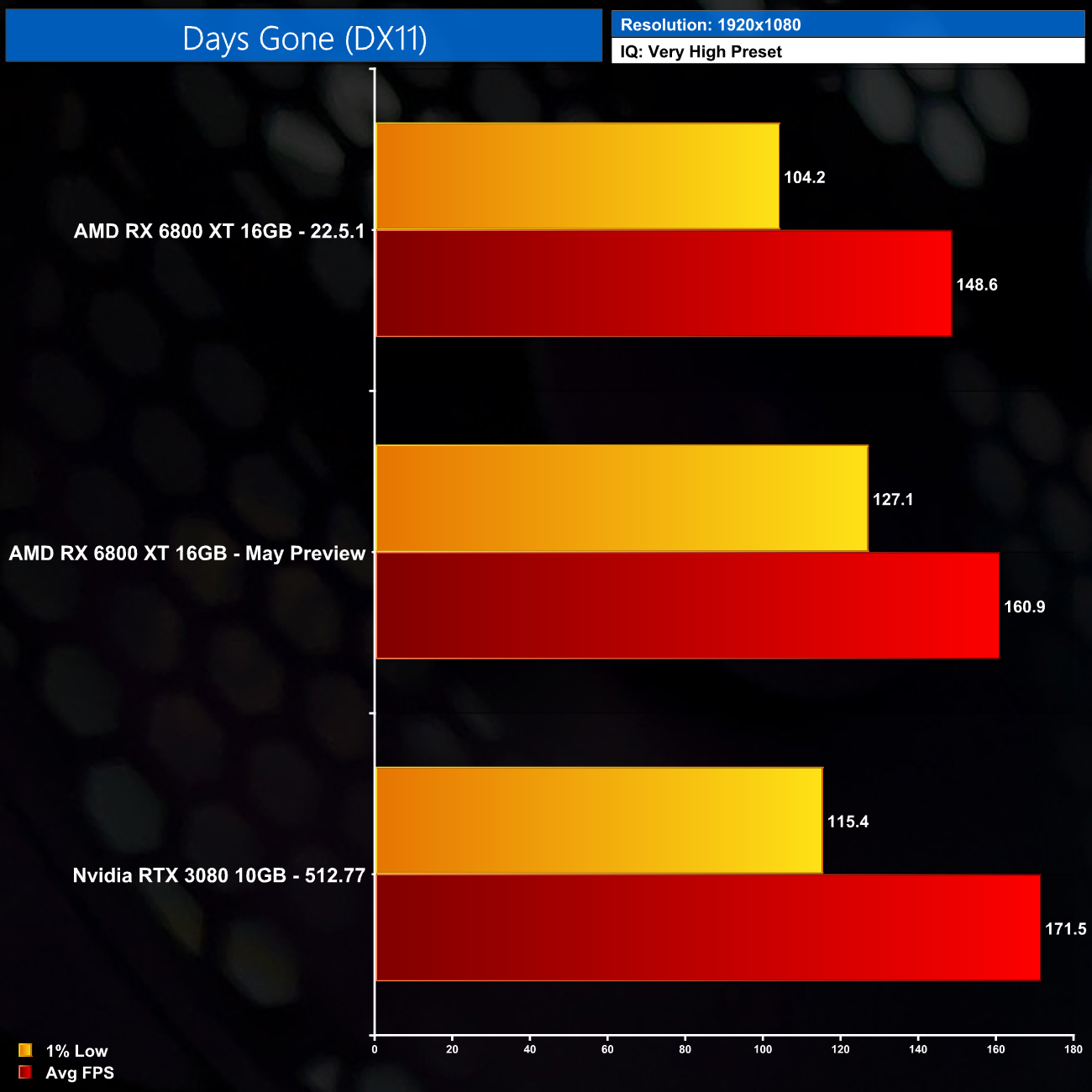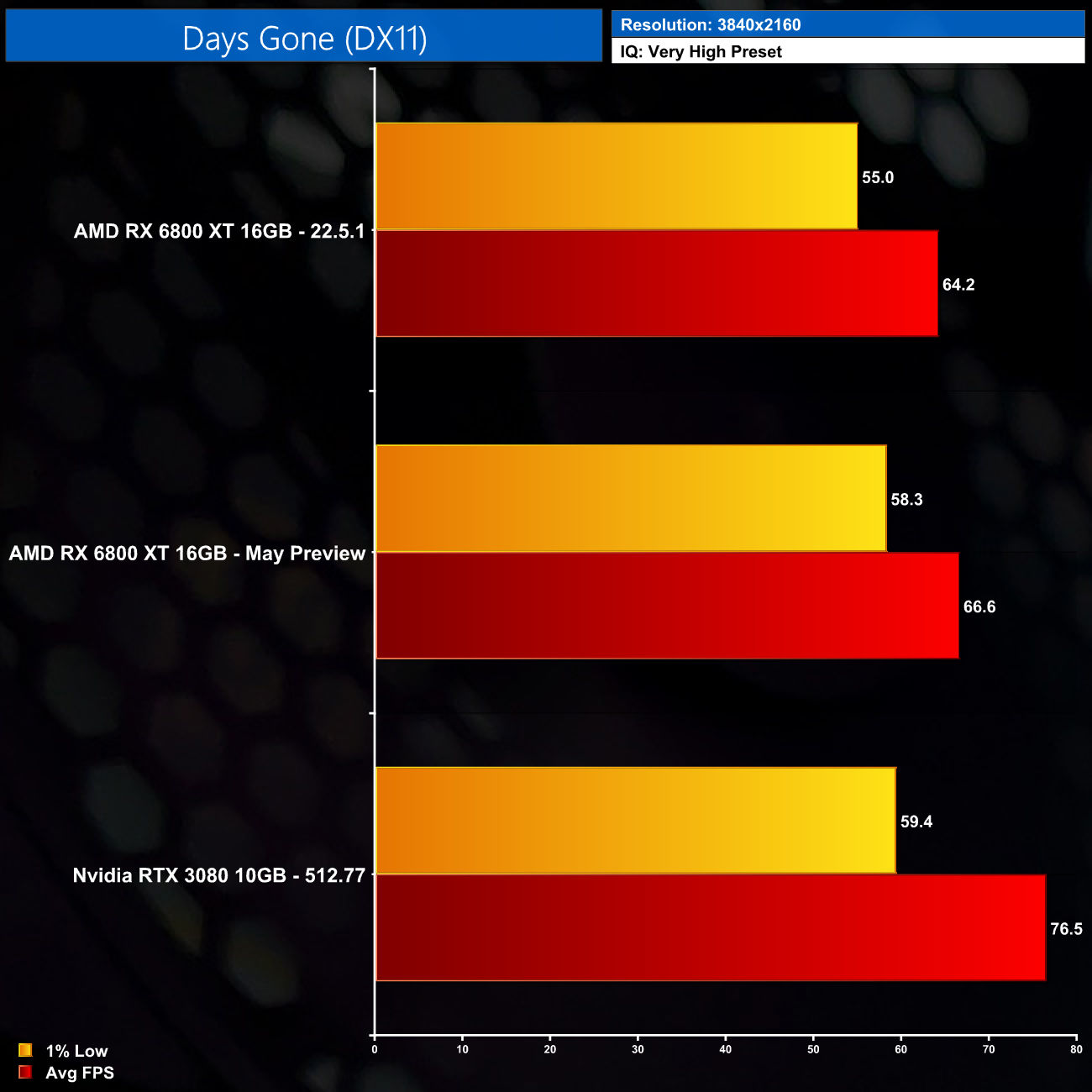 There’s more good news when looking at Days Gone, too. Focusing on 1440p here, we can see a small improvement of 6FPS to the average frame rate. Once more though, it’s the difference made to the 1% lows which I think is the bigger deal – here we are looking at a 10% gain for the 6800 XT with the Preview driver. Considering Days Gone uses Unreal Engine 4, an engine AMD has historically struggled with, this could be very good news indeed. On the next page we test Star Wars Jedi: Fallen Order, another UE4 title, to see if the trends are similar.