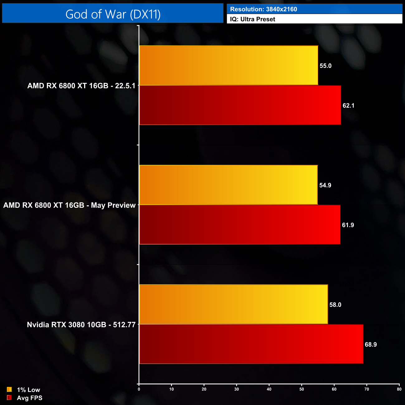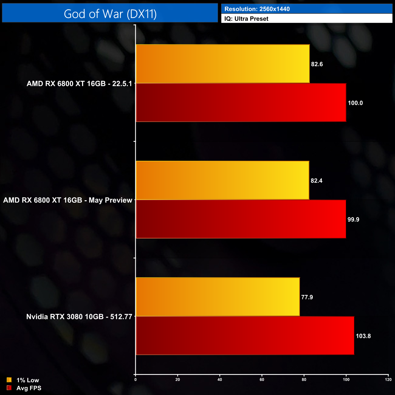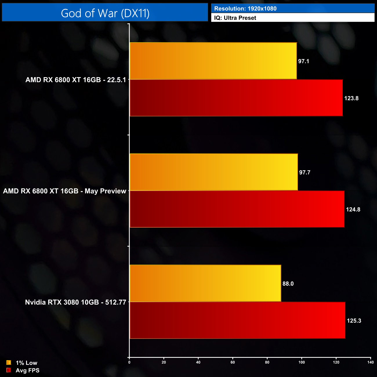 The same goes for God of War too – across every resolution I saw no difference between either AMD driver for the 6800 XT, the numbers just vary ever so slightly due to the margin of error.