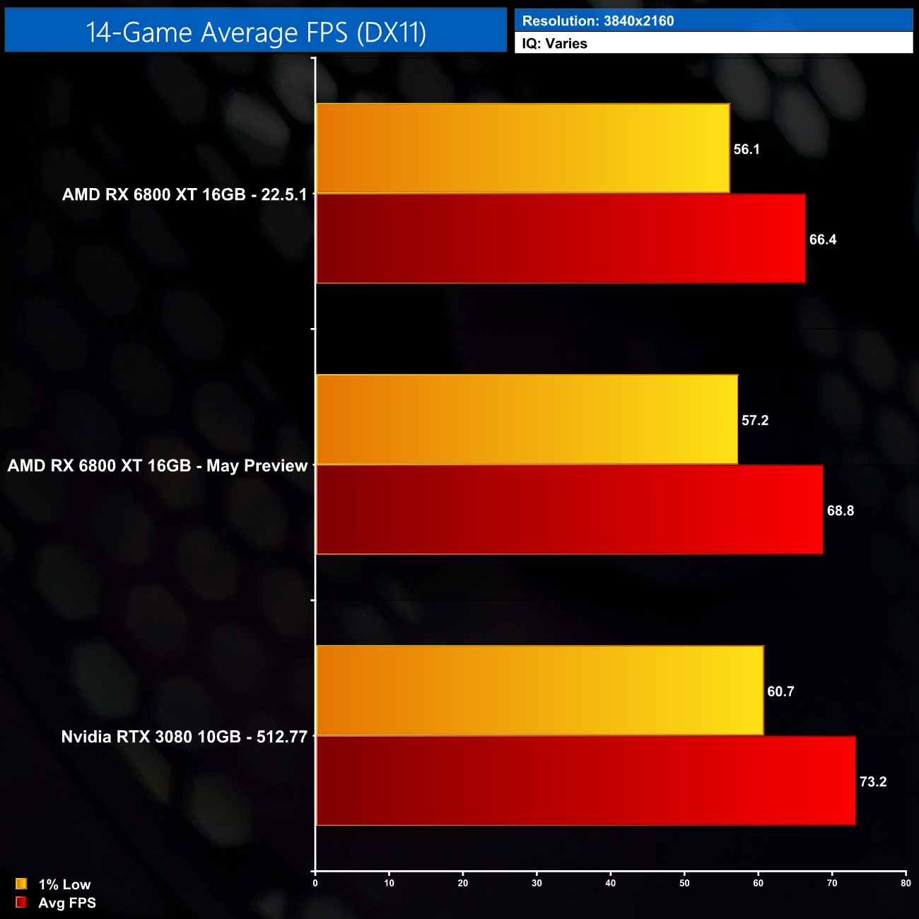 It’s more of the same at 4K too, with a 4% improvement to the average frame rate, though a smaller 2% margin for the 1% lows. The 6800 XT can’t quite catch the RTX 3080 at this resolution, but it is closer with the new driver.