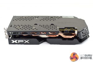 When we open up the card, too, we can also see that the actual PCB is a fair bit shorter than the shroud of the card. I measured the shroud to extend an extra 4.5cm from the end of the PCB, and hardly any of that space is even taken up by the heatsink, so it would seem XFX has decided to make the card longer for no real reason.