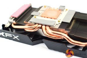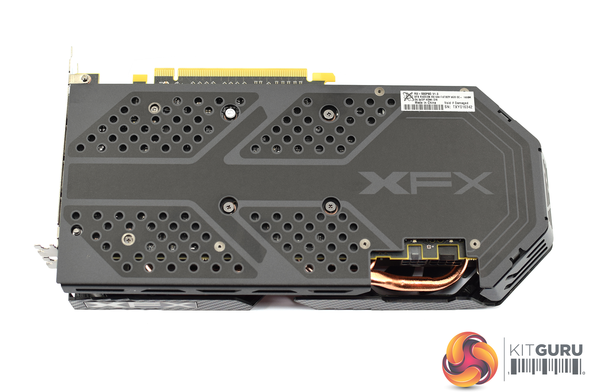 Moving back round to the front side of the card, we can see the XFX logo is stuck onto the bottom of the shroud via a sticker which could be easily removed if you didn't want it there.