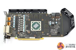 Also on the front side of the card we see the 1x 6-pin and 1x 8-pin PCIe power connectors. Just to the left of those, too, is a small BIOS switch which enables users to choose between the ‘performance' or ‘stealth' BIOS, each of which maintains clock speed at 1580MHz but adjusts the fan curve. This is something we test later in the review.