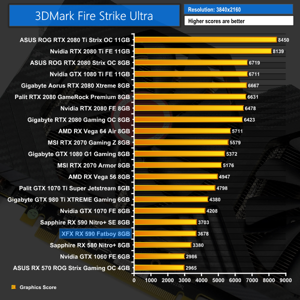 After our first set of 3DMark benchmarks, we can clearly see there is not much in it between the XFX and Sapphire RX 590 cards – the XFX is just behind, but only by the slimmest of margins.