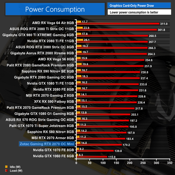 This Zotac Mini proves to be the least power hungry RTX card yet, with power draw averaging just over 170W under load. This is about 13W less than the reference clocked MSI Armor 8G card, and almost 50W less than the factory overclocked Palit GameRock Premium 2070.