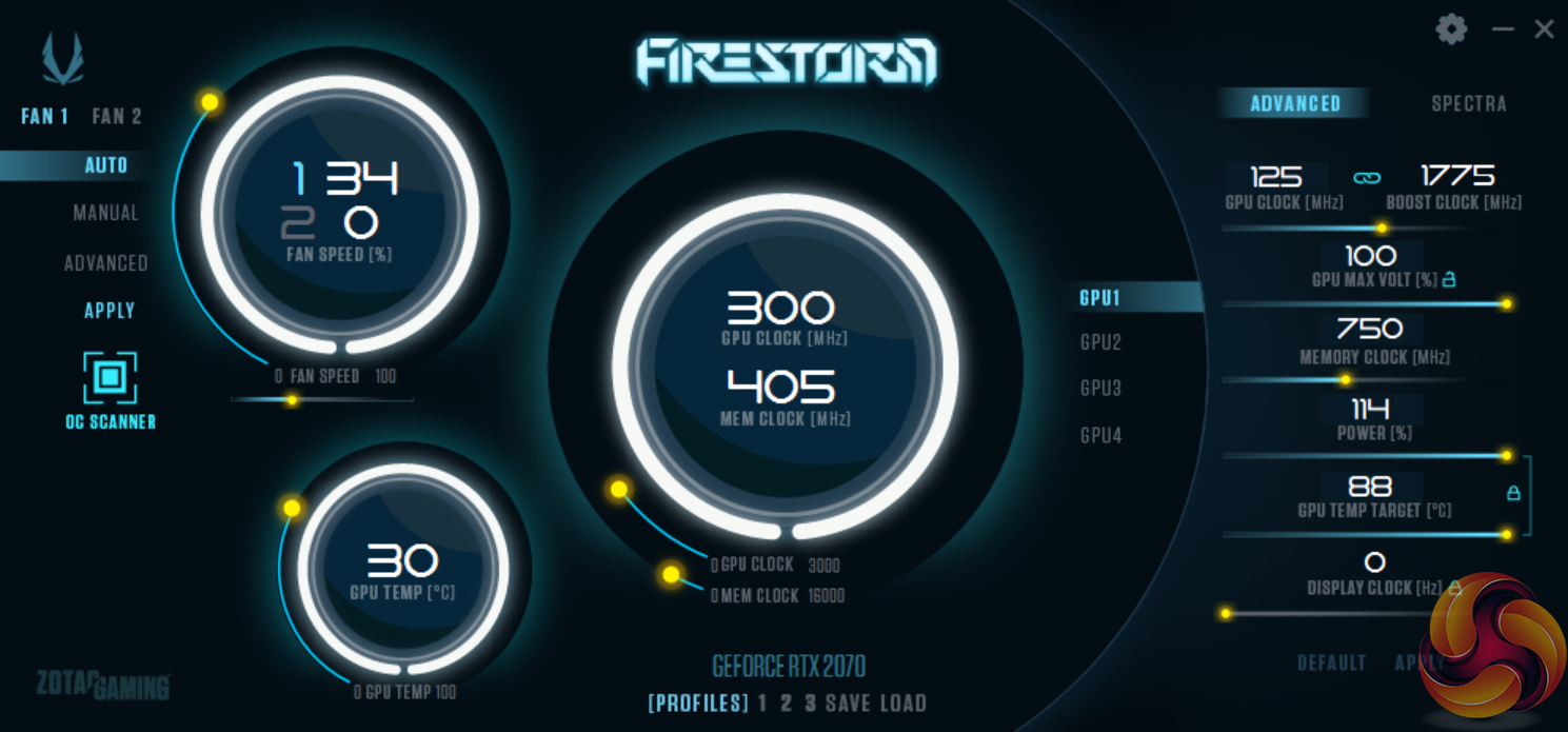 When overclocking the 2070 OC Mini, we used Zotac's FireStorm tool. We were able to add +125MHz to the GPU core, and +750MHz to the memory with the power and temperature target sliders maximised.