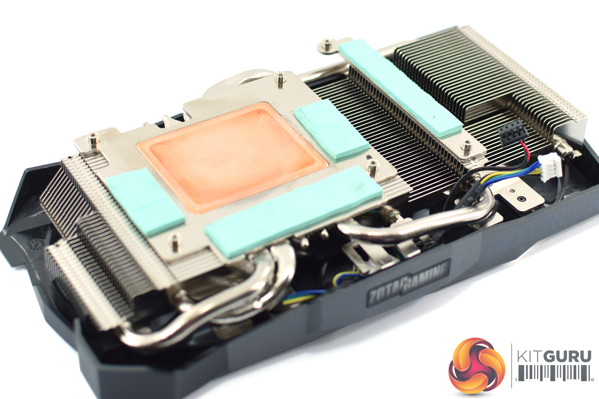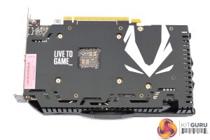 If we look at the backplate, it is relatively simple – it appears to be made of anodised aluminium, with just a small cut-out behind the GPU core. To the left of that, ‘LIVE TO GAME' has been printed in white text, while Zotac's logo (which appears to be some kind of mask or face) takes up the right-hand side of the backplate, again printed in white.