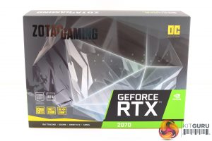 The Zotac Gaming RTX 2070 OC Mini ships in a mostly grey box, with some kind of an interesting geometric design going on on the front, though there is no image of the card itself visible.