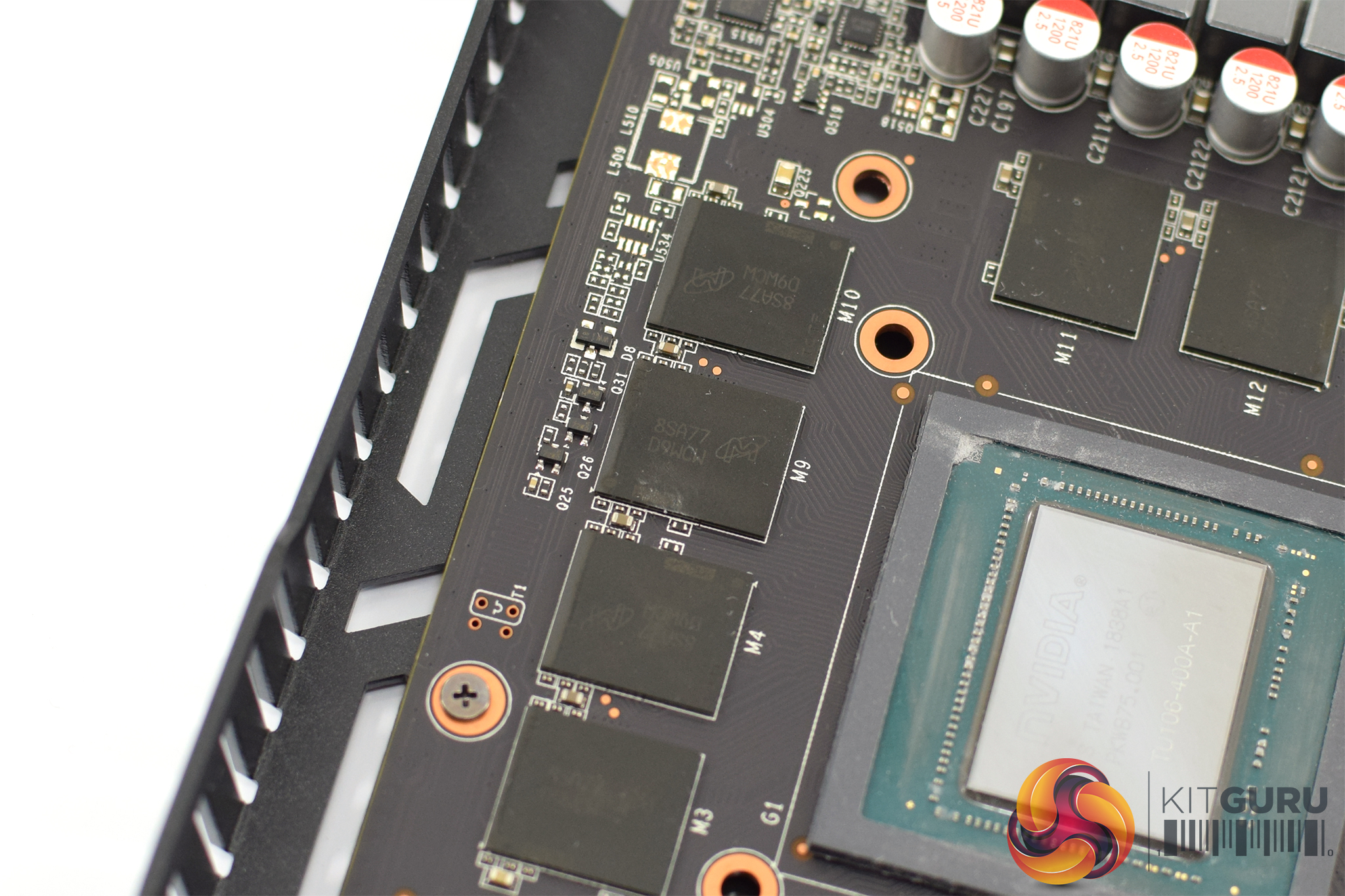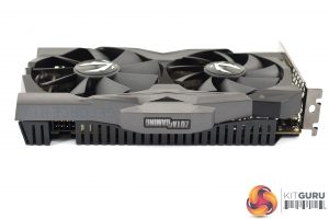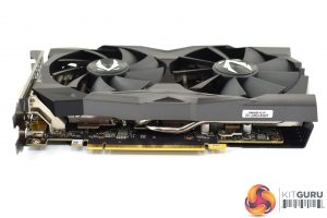 Two fans occupy the bulk of the front of the card, and you can see they are both different sizes and different blade designs. The fan on the left measures 90mm and has a swept blade design, whereas the fan on the right measures 100mm and has a straighter, flatter blade design. We asked Zotac about the reasoning behind this, and at the time of publication we are still waiting for an official response, but my guess is that the different fans are each designed to give slightly different air pressure levels to aid cooling of the GPU core, VRMs and memory chips as well as potentially reduce air turbulence.