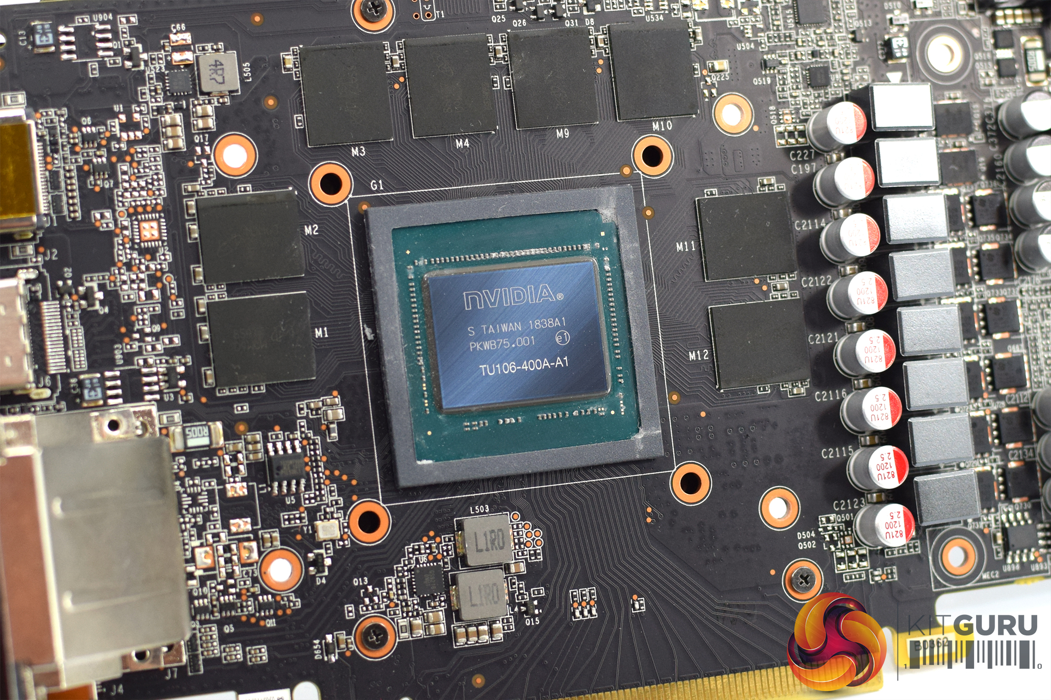 Elsewhere, Zotac has stuck with 6+2 power phases – the same as Nvidia's Founders Edition 2070 cards, and our 8GB of GDDR6 memory comes from Micron, with the chips labelled ‘8SA77D9WCW'. The GPU die is labelled TU106-400A, signifying it is a binned chip suitable to be sold with a factory overclock – though as we mentioned, Zotac has not been very adventurous with it by adding just 30MHz to the core compared to reference speeds.