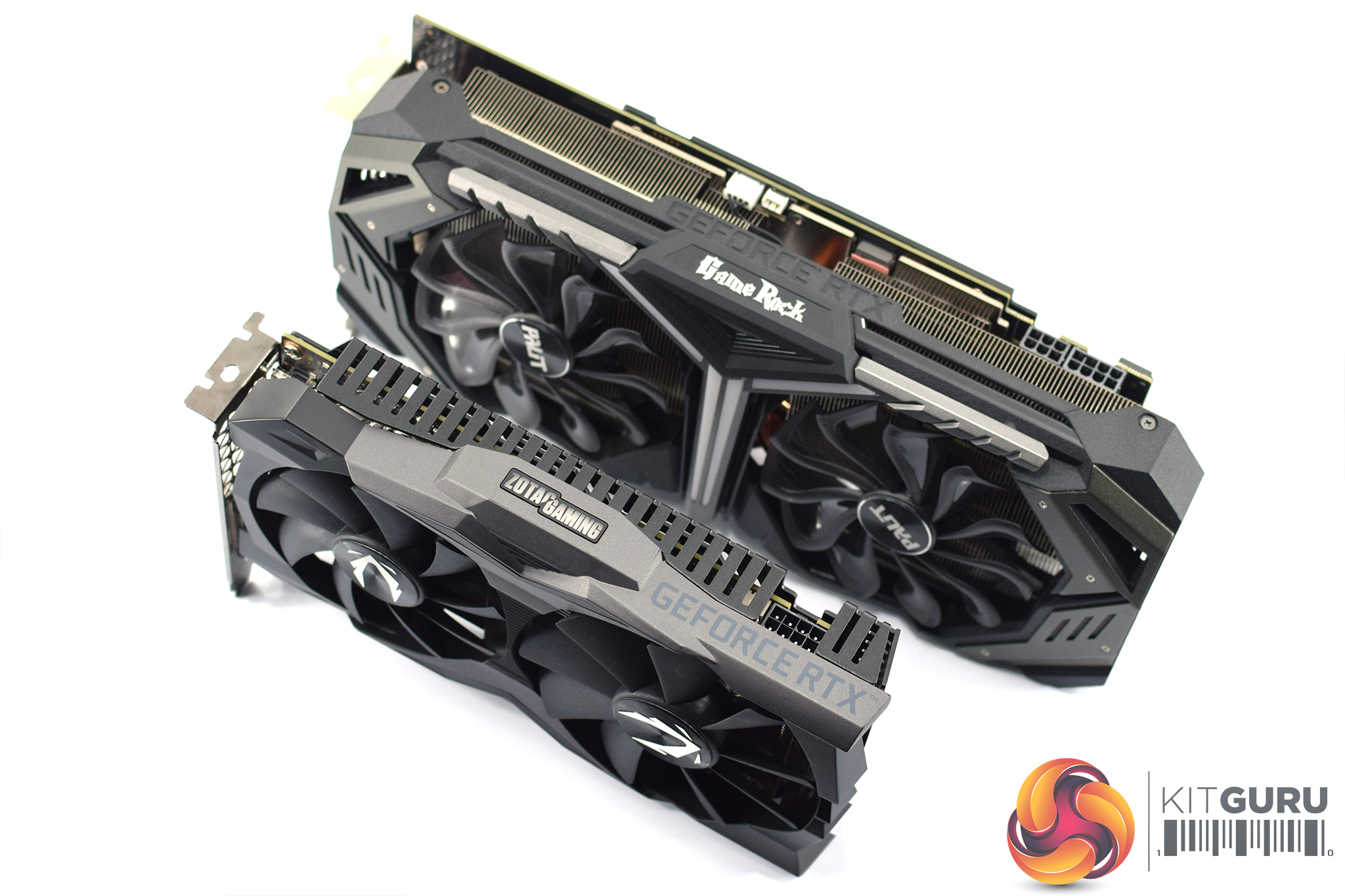 Above you can see also see two pictures of the Zotac Mini compared to the Palit RTX 2070 GameRock Premium to really highlight this size difference – both are 2070s, yet one is a very short and dinky 2-slot card, while the other is almost 30cm long and effectively a triple-slot card. They obviously have different target audiences, but it really does highlight the dimensions of this Zotac card.