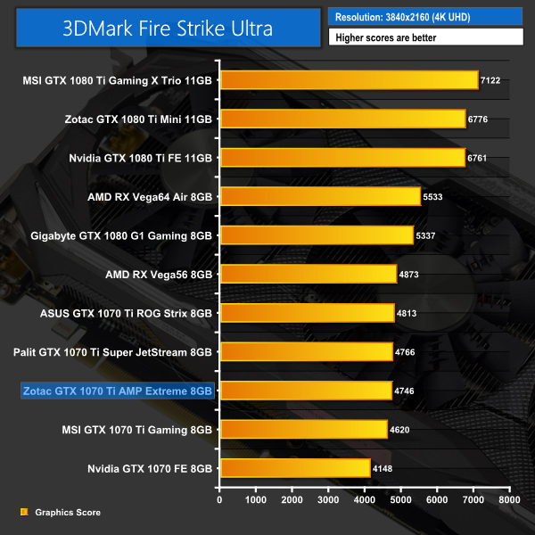 It is a good start for the AMP Extreme GTX 1070 Ti here – it posts the highest scores yet for a 1070 Ti in Fire Strike and Time Spy, while it is still competitive in the 4K Fire Strike Ultra test.