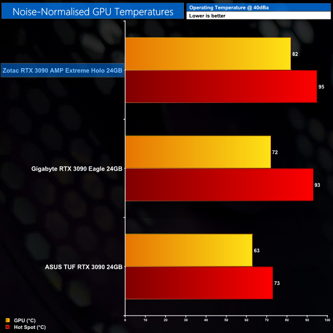 Following on from our stock thermal and acoustic testing, here we re-test the operating temperature of the GPU, but with noise levels normalised to 40dBa. This allows us to measure the efficiency of the overall cooling solution as varying noise levels as a result of more aggressive fan curves are no longer a factor.