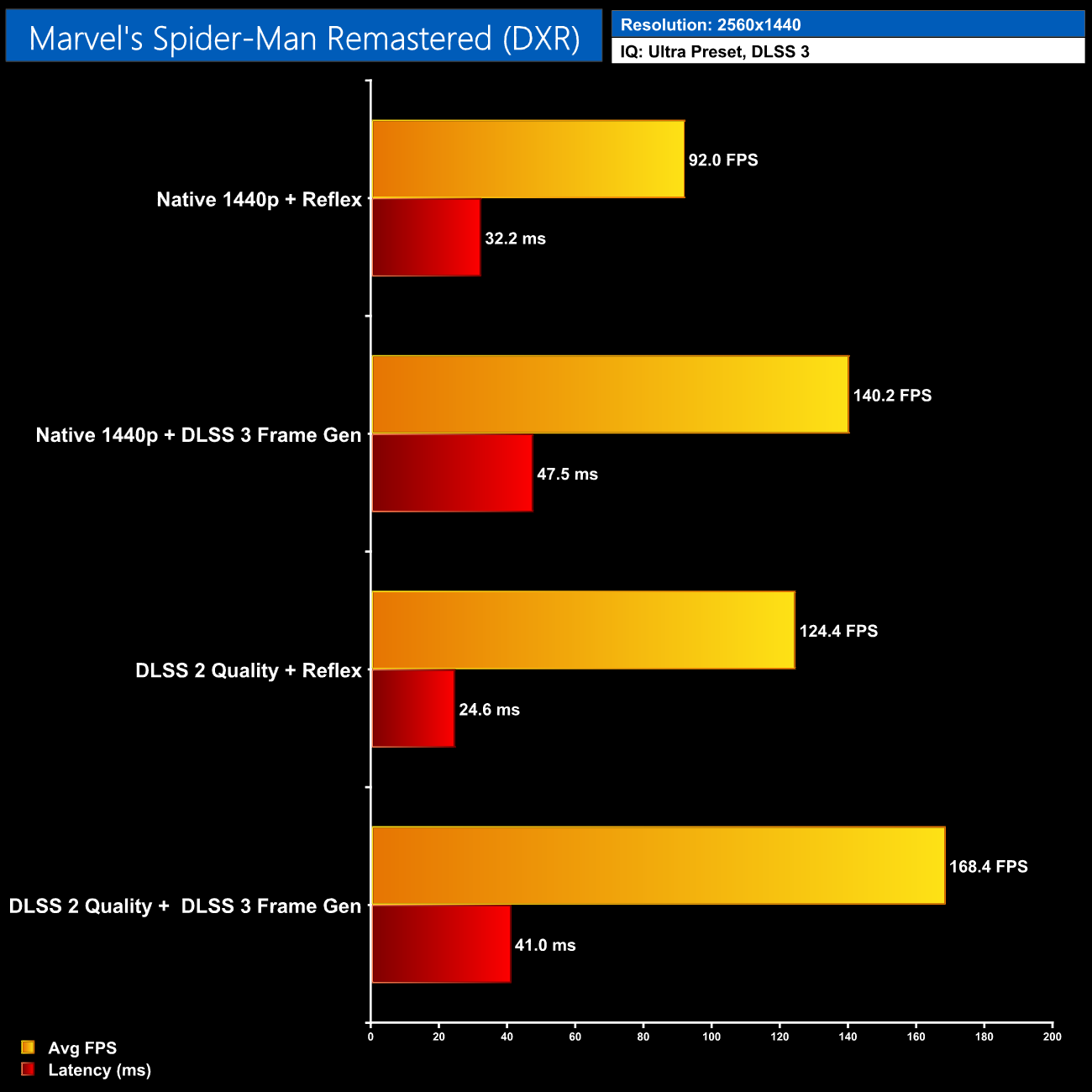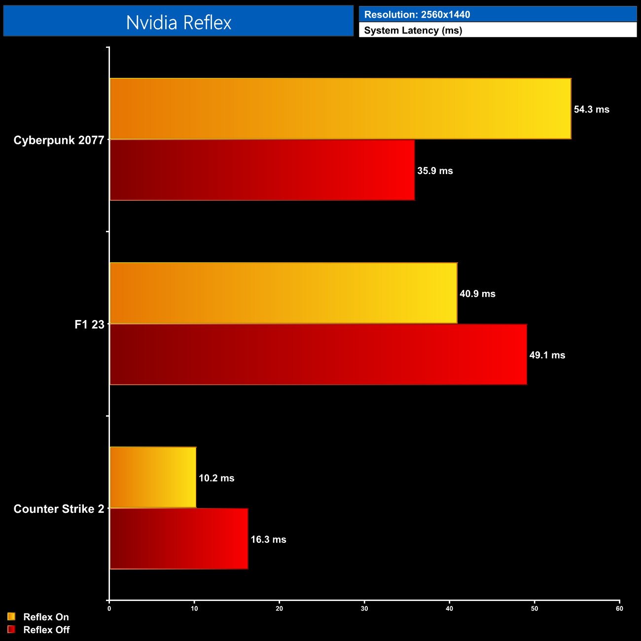 Nvidia's reflex technology is also supported, designed to lower latency – particularly important in competitive esports where every millisecond counts. Enabling Reflex is as simple as toggling the feature on within the game settings, and it can make a big difference in reducing latency, as we can see above. To learn more about Reflex, we previously covered the technology HERE.
