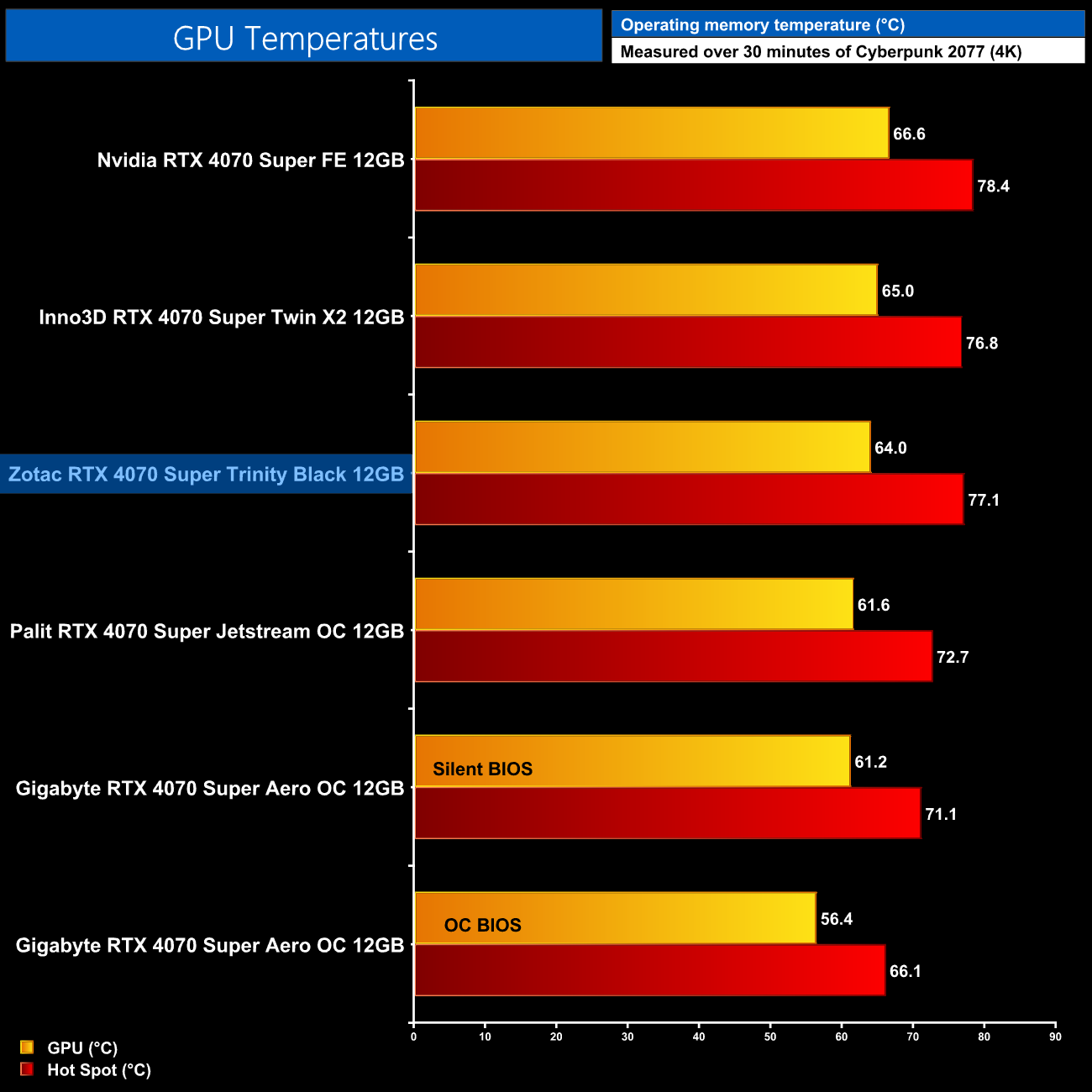 For our temperature testing, we measure the peak GPU core temperature under load. A reading under load comes from running Cyberpunk 2077 for 30 minutes.