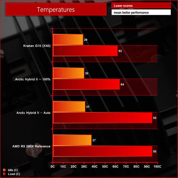 We can see that the thermal performance of this cooler is quite impressive with the fan set at full speed, coming close to matching the NZXT Kraken G10 and X40 combination. With the profiles set to auto, the target temperature is set to 95 degrees C, hence the less than impressive score.