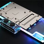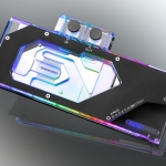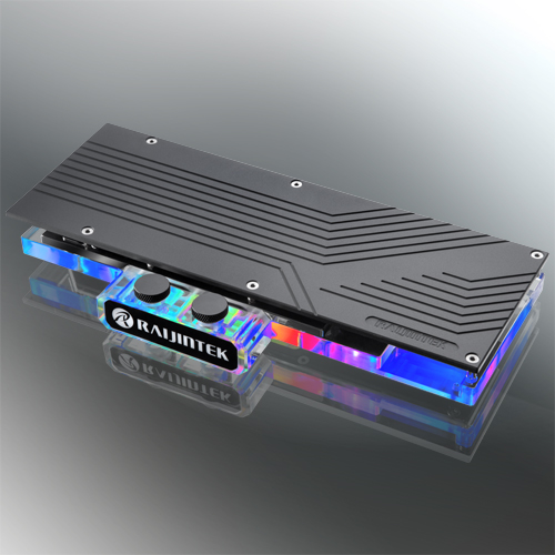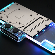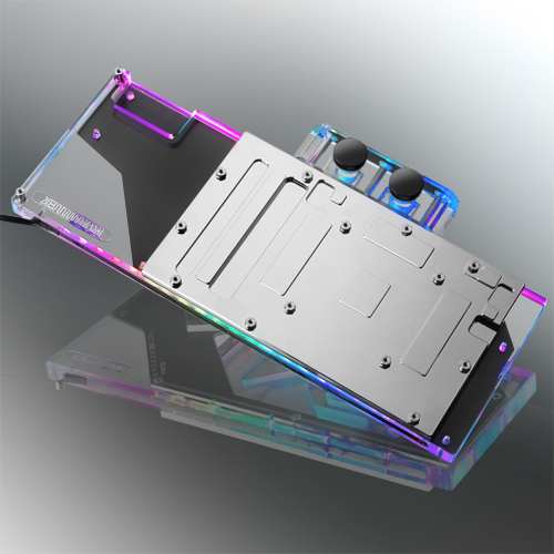 The 12mm thick clear acrylic top cover features built-in G1/4” inlets/outlets for SLI compatibility with full RGB illumination that can be configured and controlled with motherboard manufacturer RGB apps via a 4-pin 5v ARGB header. A black aluminium backplate offers an enhanced aesthetics while providing passive cooling to the VRM on the rear of the card.