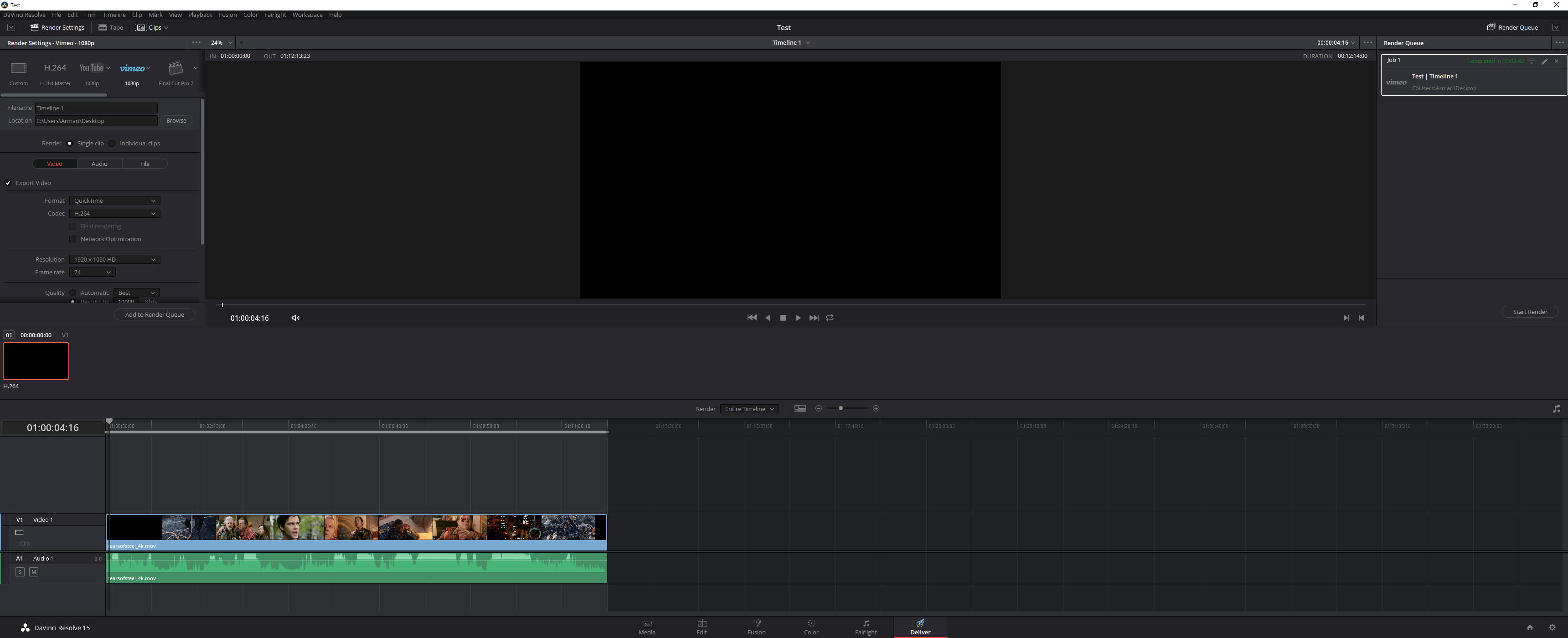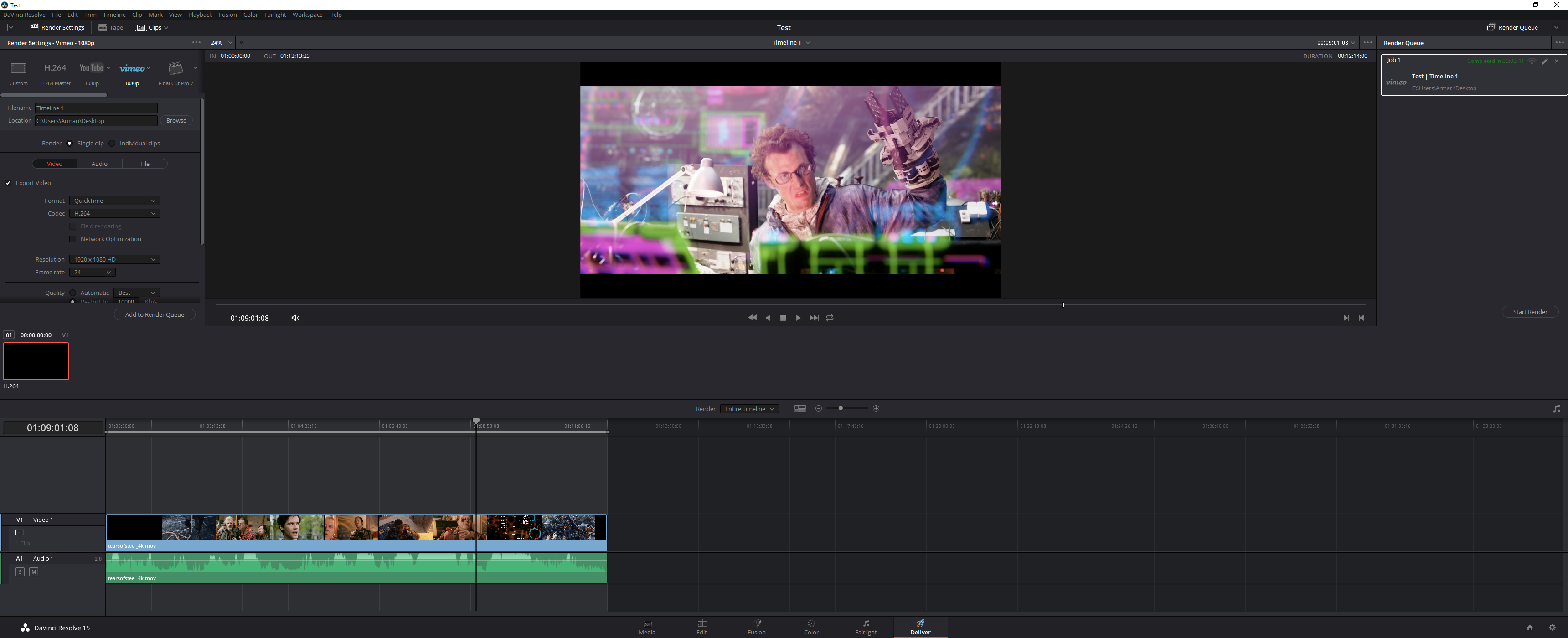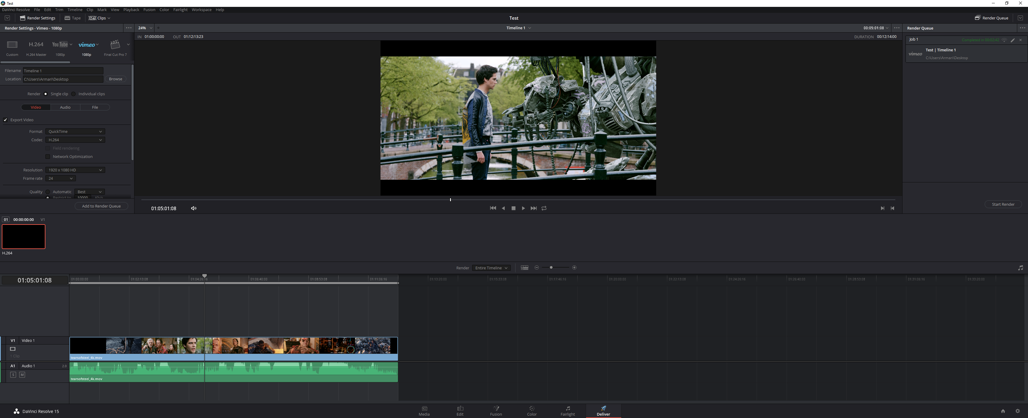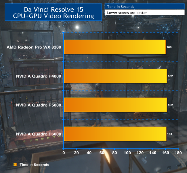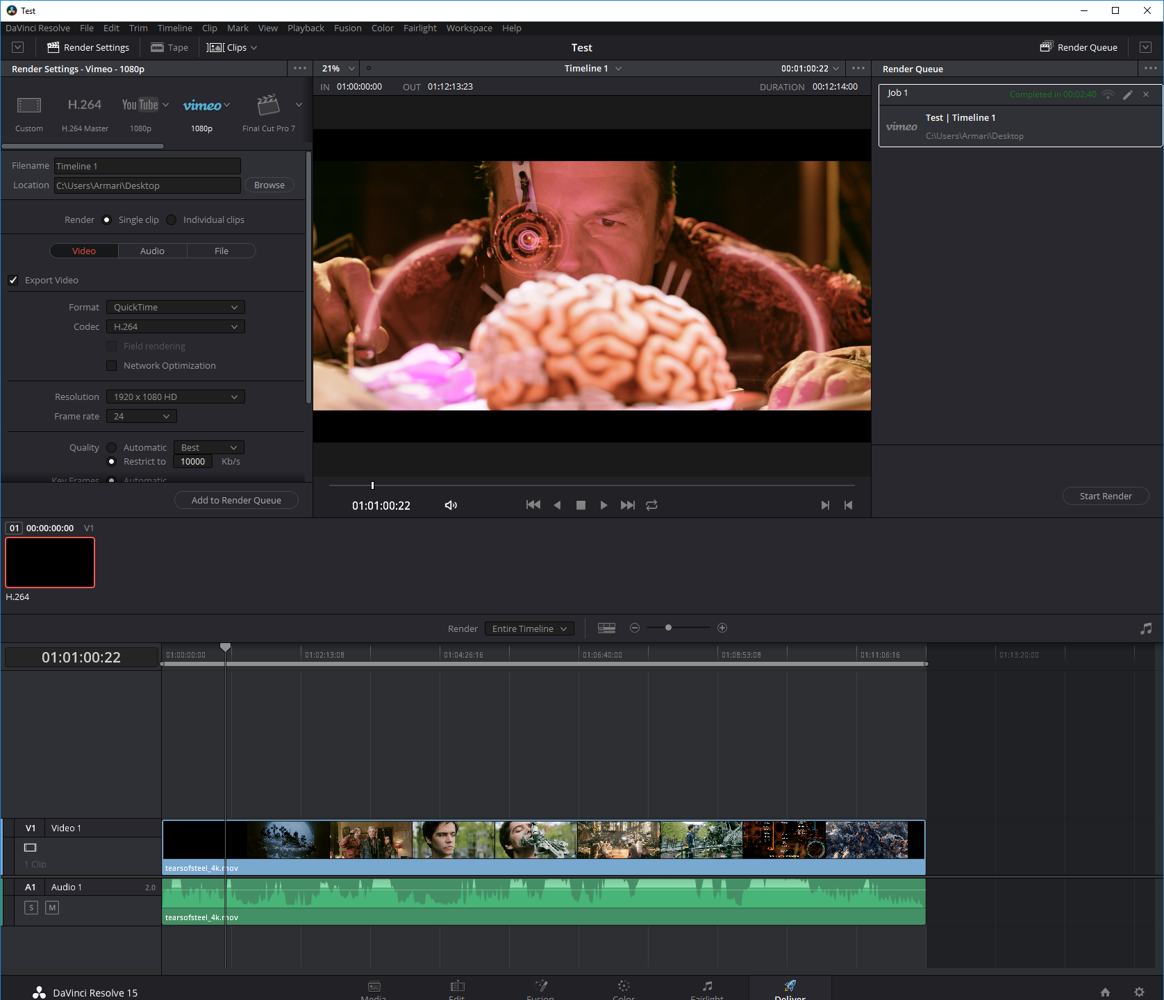 Again, we used the 4K UHD (3,840 x 2,160) version of the Blender Mango Project Tears of Steel movie, and again we encoded with the Vimeo 1080p HD preset provided. This is a MP4 H.264 preset, using High Profile and Level 4.2. Resolve 15 supports acceleration via CUDA on NVIDIA graphics and OpenCL on AMD graphics. You can't turn off graphics acceleration, however, so all the following results are with the GPU enabled.