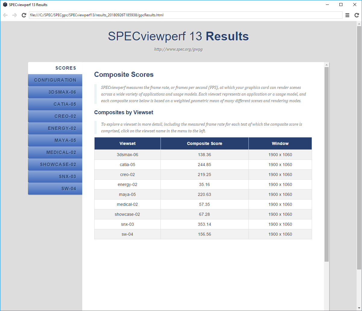 The SPECviewperf 13 benchmark is the worldwide standard for measuring graphics performance based on professional applications. The benchmark measures the 3D graphics performance of systems running under the OpenGL and Direct X application programming interfaces. The benchmark’s workloads, called viewsets, represent graphics content and behavior from actual applications.