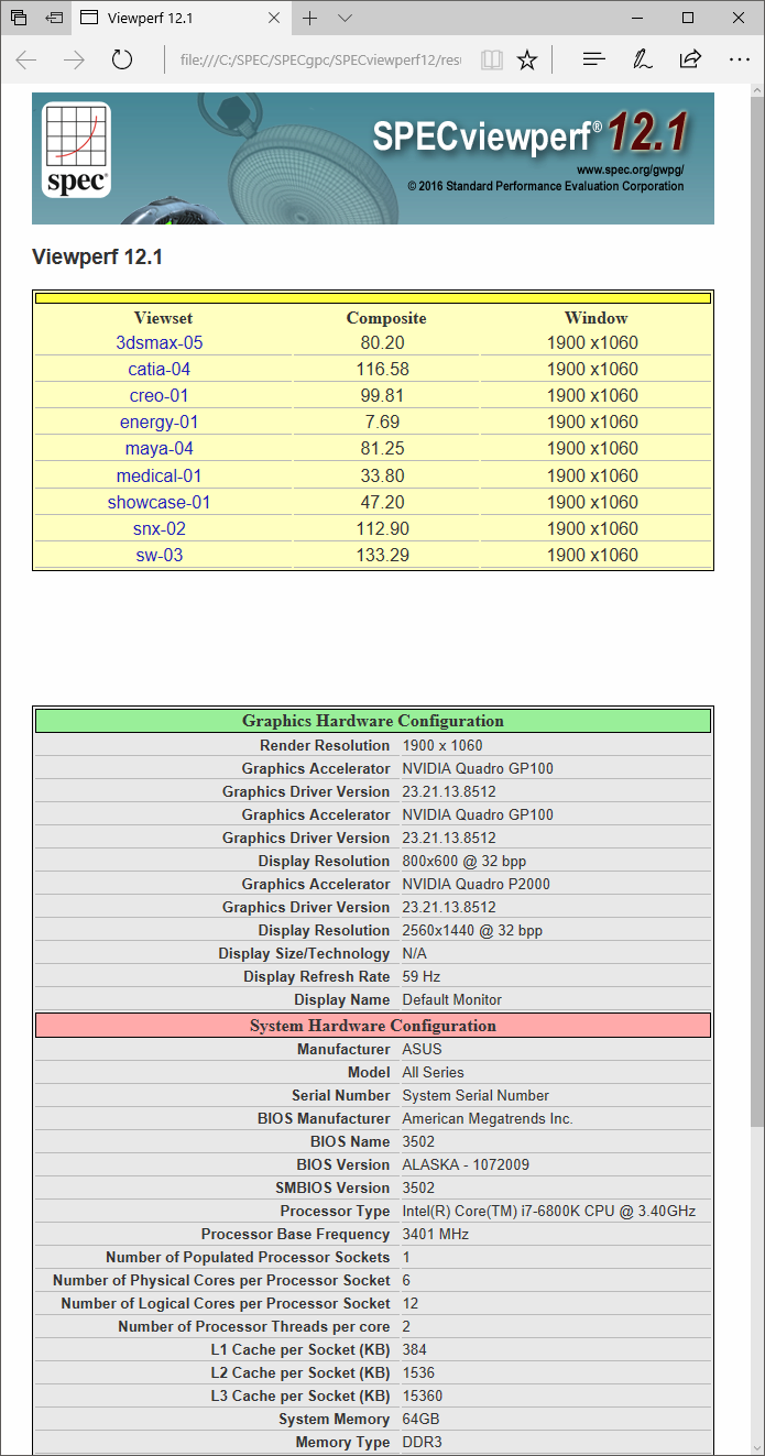 The SPECviewperf 12.1 benchmark is the worldwide standard for measuring graphics performance based on professional applications. The benchmark measures the 3D graphics performance of systems running under the OpenGL and Direct X application programming interfaces. The benchmark’s workloads, called viewsets, represent graphics content and behaviour from actual applications.