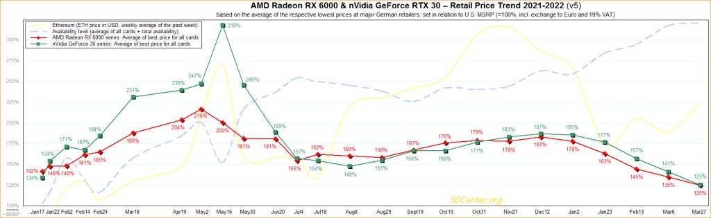 While the RX 6800 series cards are still maintaining high prices, the RX 6500 XT has dropped to MSRP levels. Soon, the RTX 3080 Ti may also hit MSRP pricing – currently the GPU sells for 7% over MSRP on average in Europe. Other cards, like the RX 6600 and the RTX 3090 are still selling for up to 20% over MSRP, but we have good reason to believe that prices drops will continue over Q2.