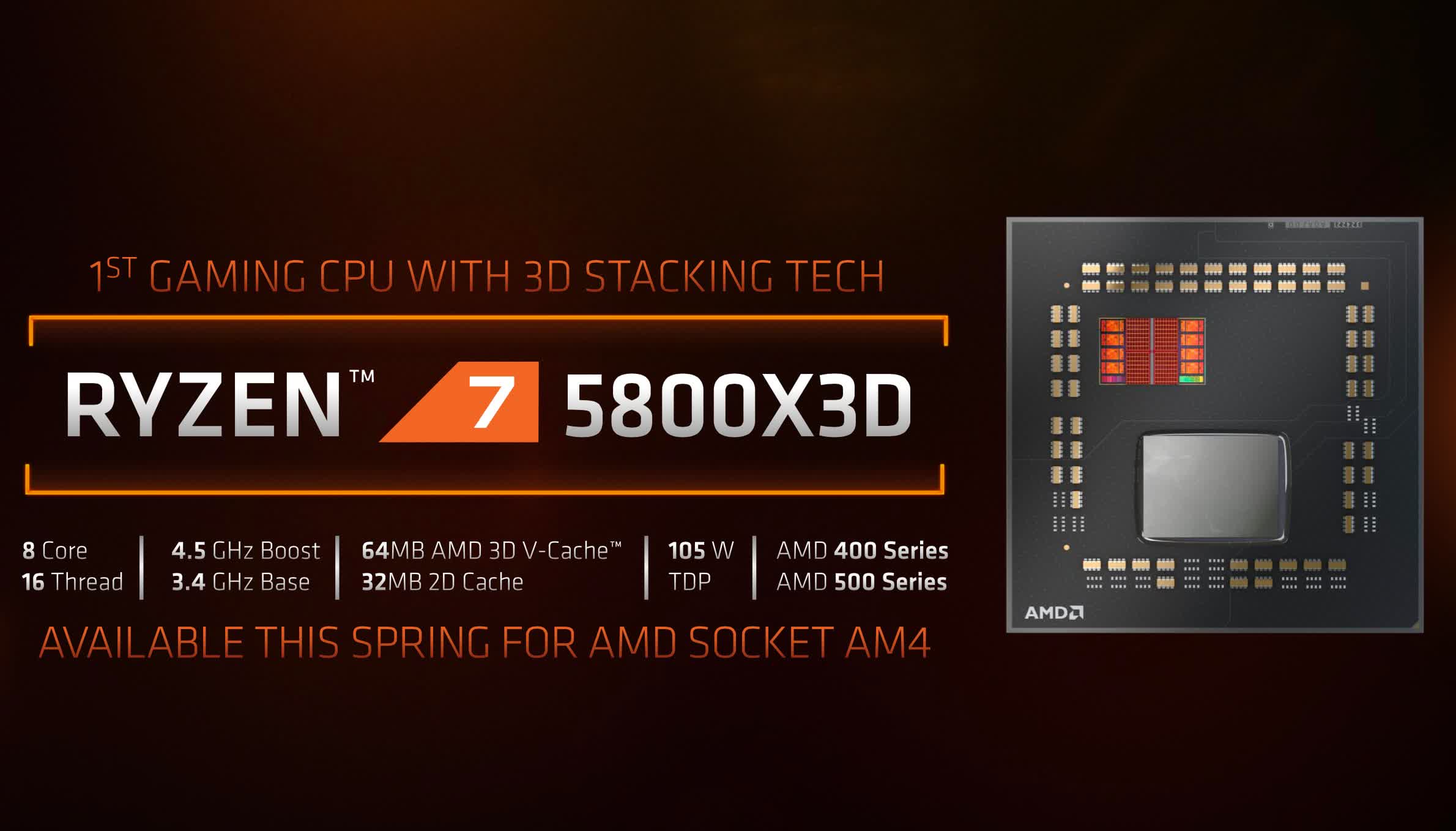 Contrary to most people's predictions, AMD will be releasing a single Ryzen 5000 series processor with 3D V-cache, and that's the Ryzen 7 5800X3D. Most of this processor's spec sheet matches up with the Ryzen 7 5800X, but it packs an extra 64MB of V-Cache for a total of 96MB of cache. According to AMD, this is enough to bump gaming performance by up to 40%, despite the lower base (3.4GHz) and boost clock (4.5GHz) frequencies.