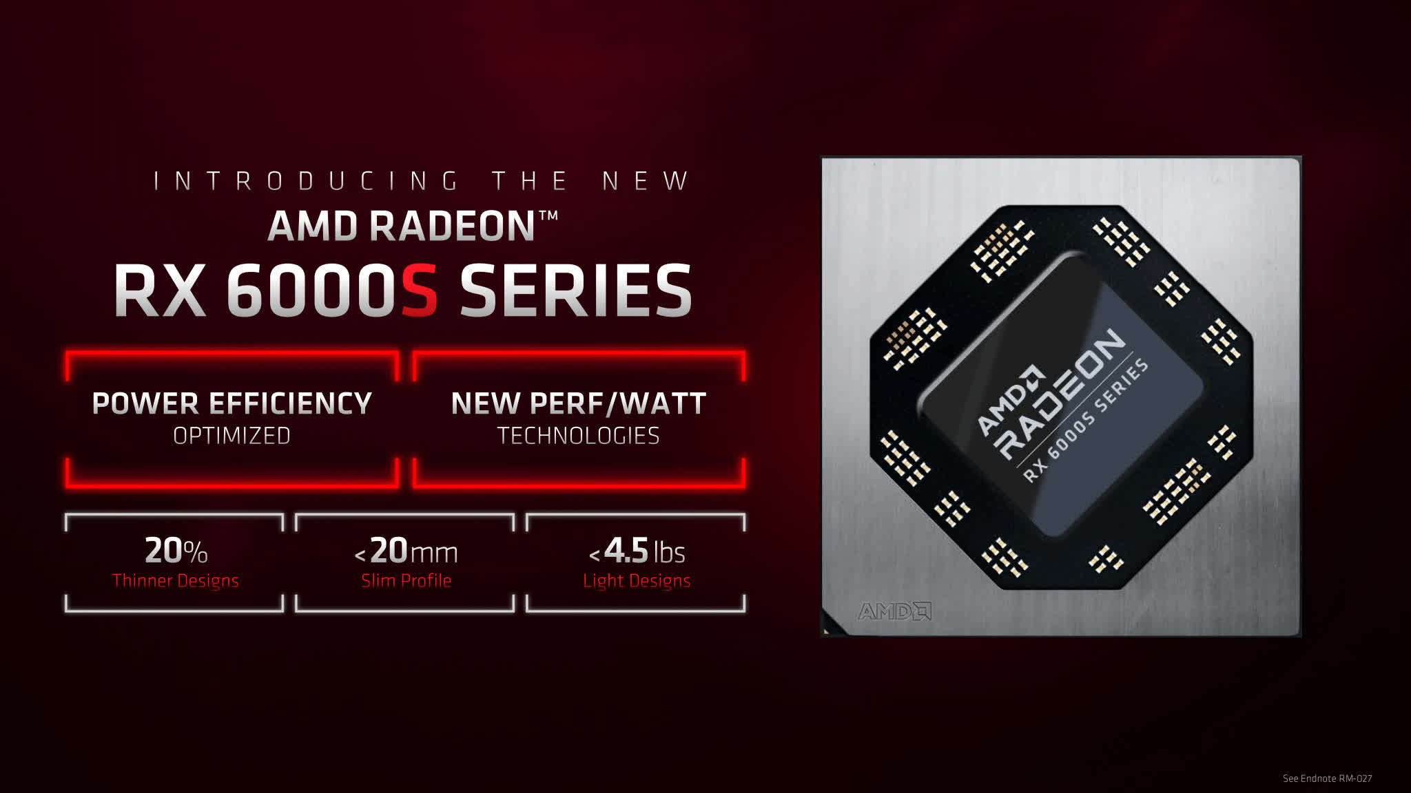 Also, for laptops, AMD will be releasing new Radeon RX 6000M series GPUs and the new RX 6000S series GPUs. The new RX 6000M series include the RX 6850M (7% faster than the 6800M), RX 6650M XT (20% faster than the 6600M) and RX 6650M, featuring up to 7% higher clock frequencies and faster memory (probably clocked at 16Gbps and 18Gbps). Additionally, there are the RX 6500M and the RX 6300M GPUs, AMD's first 6nm mobile graphic chips featuring a 35W TDP.