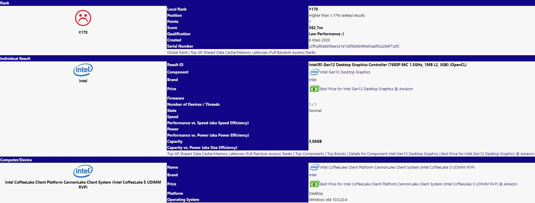 According to the SiSoftware database entry (via VideoCardz), the Intel Xe DG1 will have 3GB of video memory, a GPU clock speed of 1.50GHz, 1MB of L2 cache, and 96 execution units (EUs), resulting in 768 shader processors.