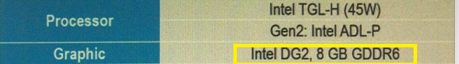 In other news, an image shared by Uniko's Hardware shows a device listing with a DG2 graphics card with 8GB of GDDR6 memory and a Tiger Lake-H processor (45W), Intel's 8-core high-end mobile processors. This DG2 GPU should be the 512 EUs variant, with a 256-bit memory bus. The other processor option for this device looks to be an Intel Alder Lake-P CPU, expected to release in 2021.