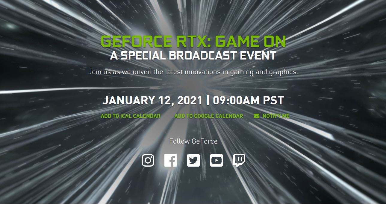 Nvidia has scheduled a press event for January 12th that will focus on its RTX products. The company hasn't specified what will be presented during this event, but rumours suggest it could be RTX 30 series mobile GPUs, RTX 3080Ti, RTX 3060 or any combination of the three.