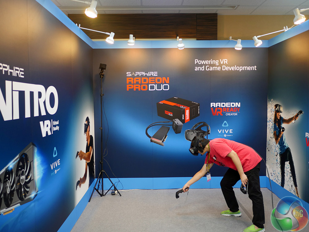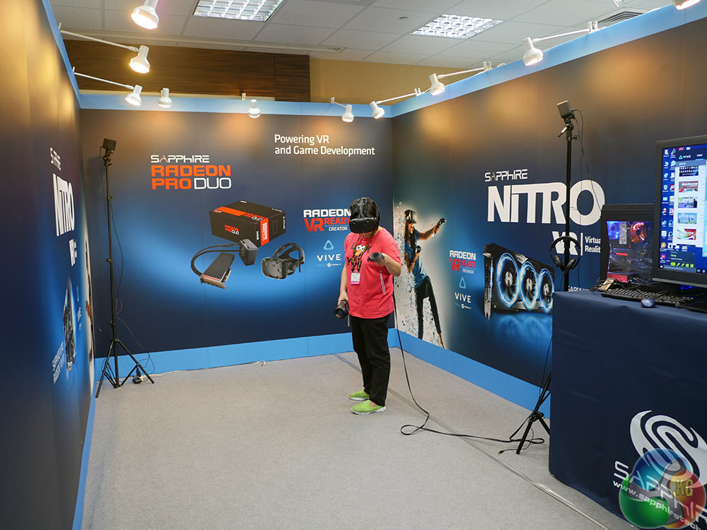 Although AMD might have begun showing off its first Polaris cards at this year's Computex show, Sapphire is still looking to the previous generation to power its systems and yours. At its booth, we found it showing off a HTC Vive VR headset which anyone could try, all powered by a powerful Radeon Pro Duo.