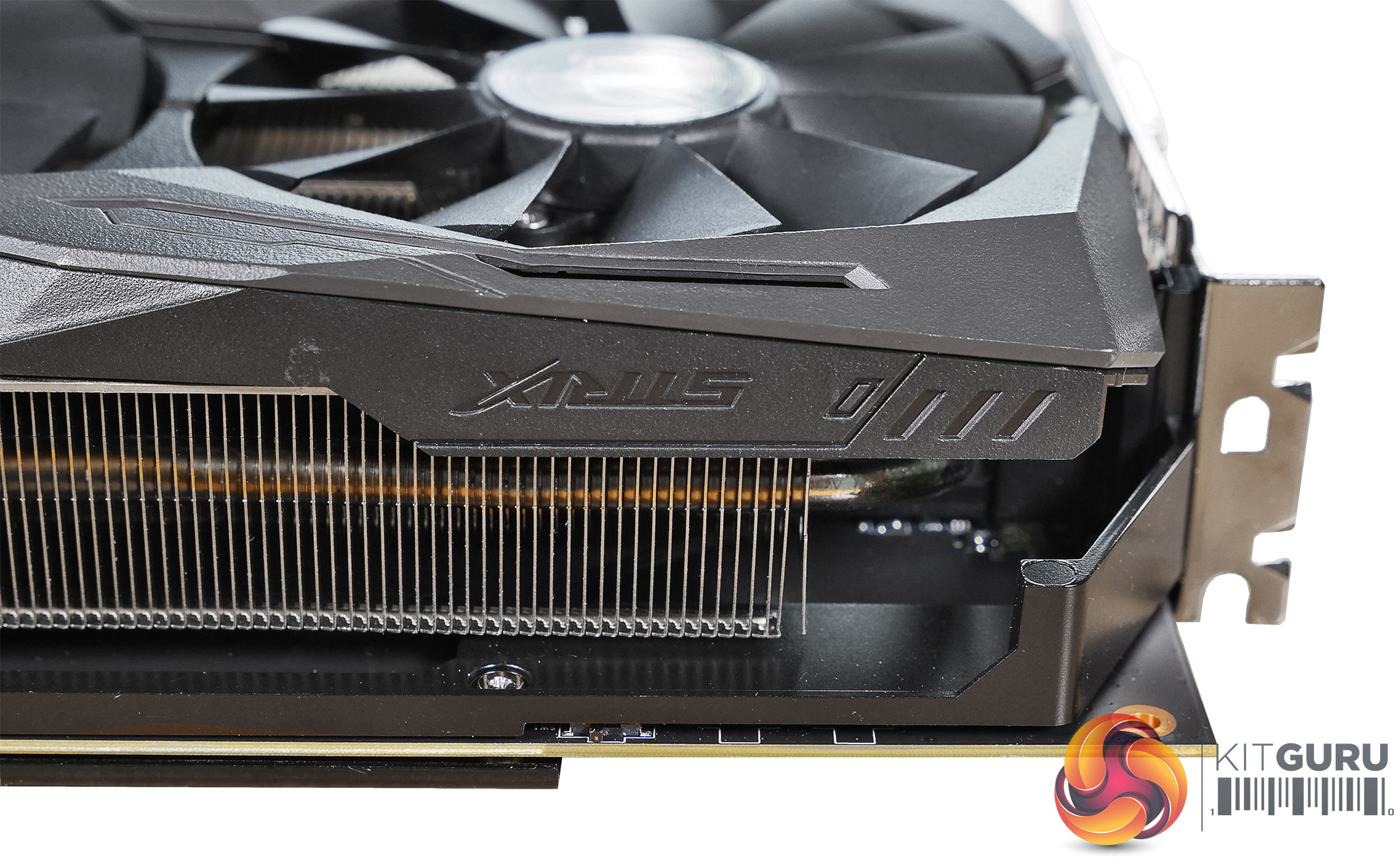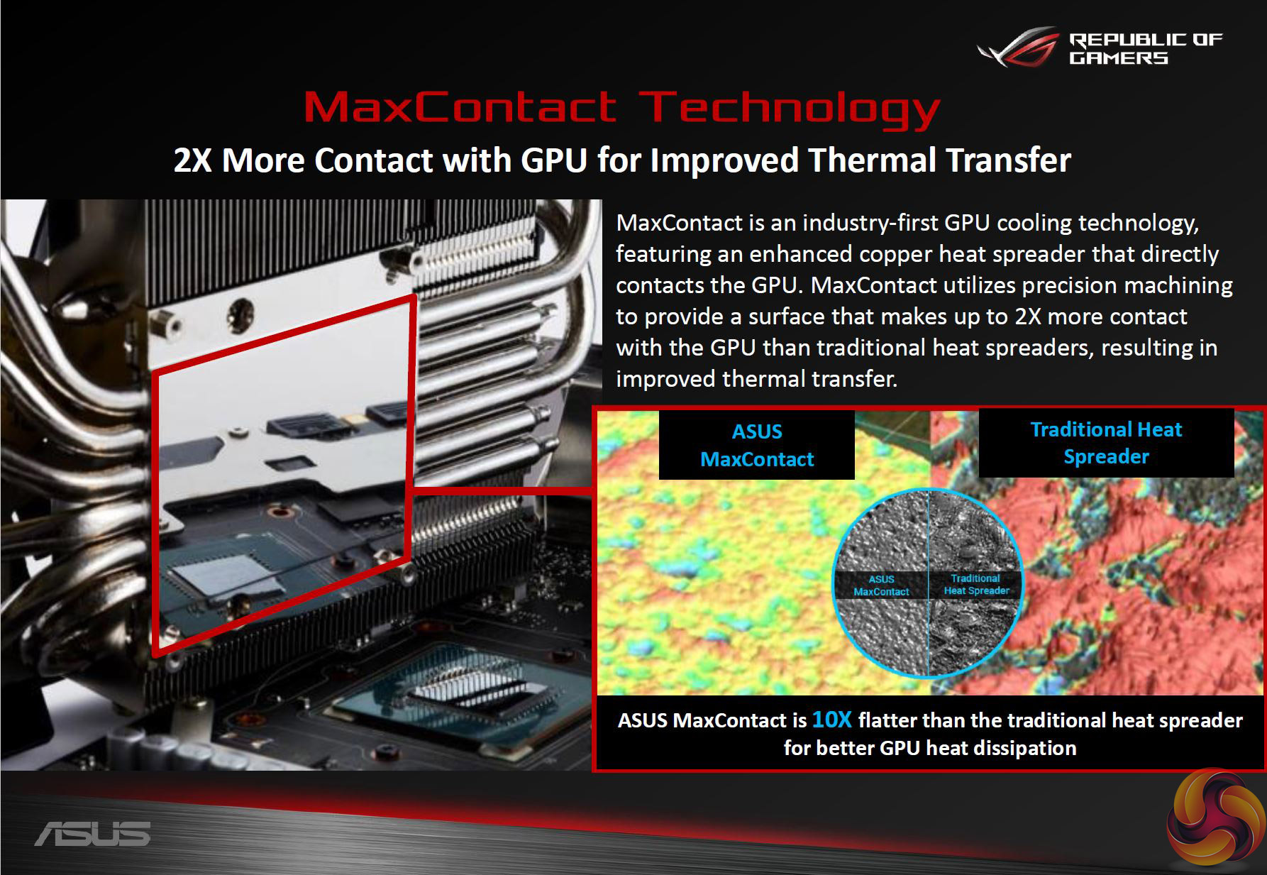 Humans only get involved when it is time to install the cooler, and that is a tricky affair on a graphics card that uses HBM2 as the cooler needs to work perfectly on both the GPU and memory. Asus calls the surface finish on the cooler MaxContact and says the copper heat spreader is machined to double the contact area that meets the GPU. Asus also told us they use thermal compound that is more viscous than you might expect, to prevent it from being pumped out over a period of time.