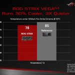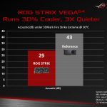 Other features of the ROG Strix RX Vega64 include Aura Sync lighting, a substantial backplate, triple cooling fans and Asus FanConnect II. The main claim that Asus makes about ROG Strix RX Vega64 is that the working temperature is 78°C, compared to the reference design which runs at 85°C. That’s a useful advantage however Asus also claims the noise levels are 29dB compared to 43dB for the stock graphics card, which looks like a double whammy for the reference design.
