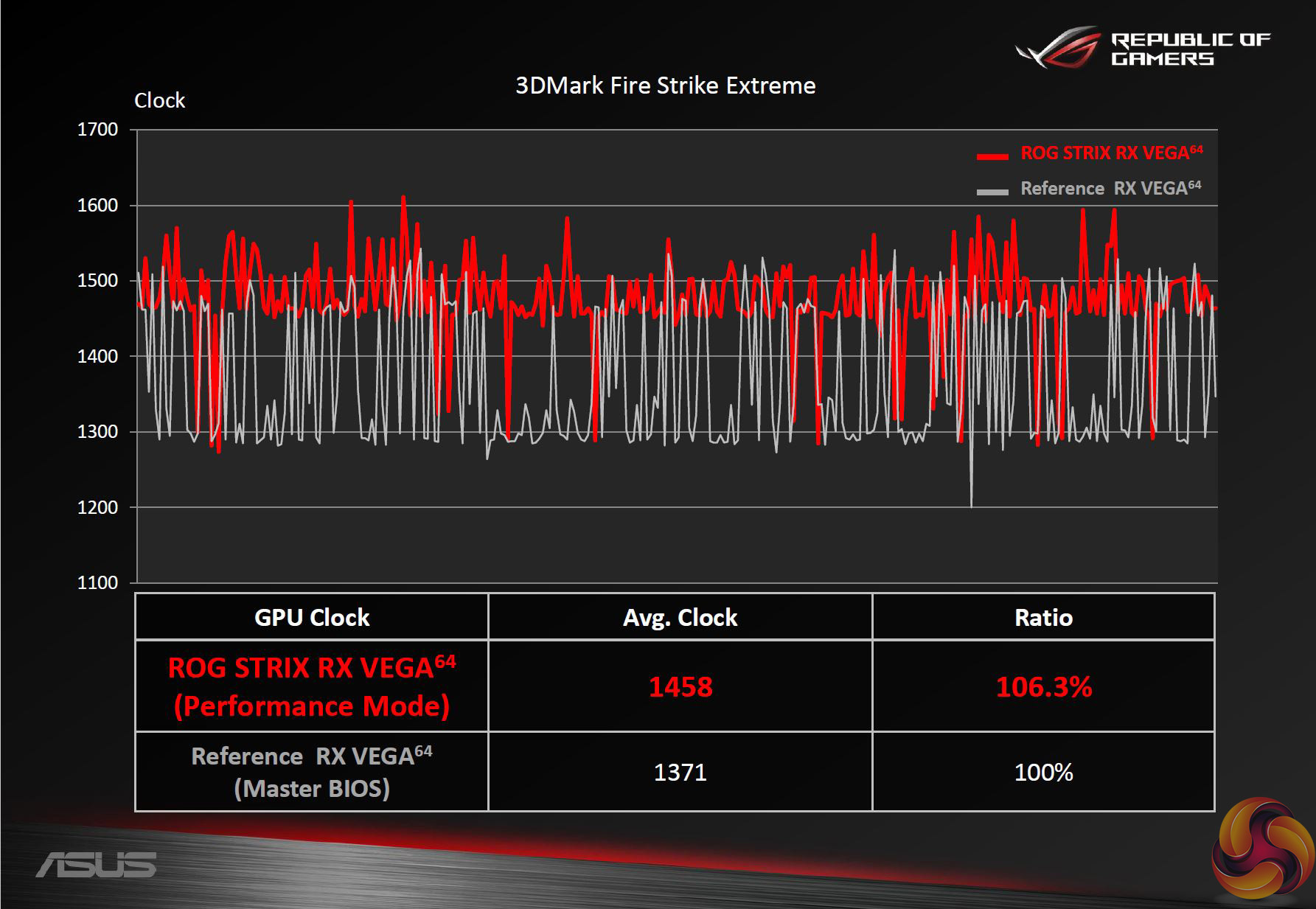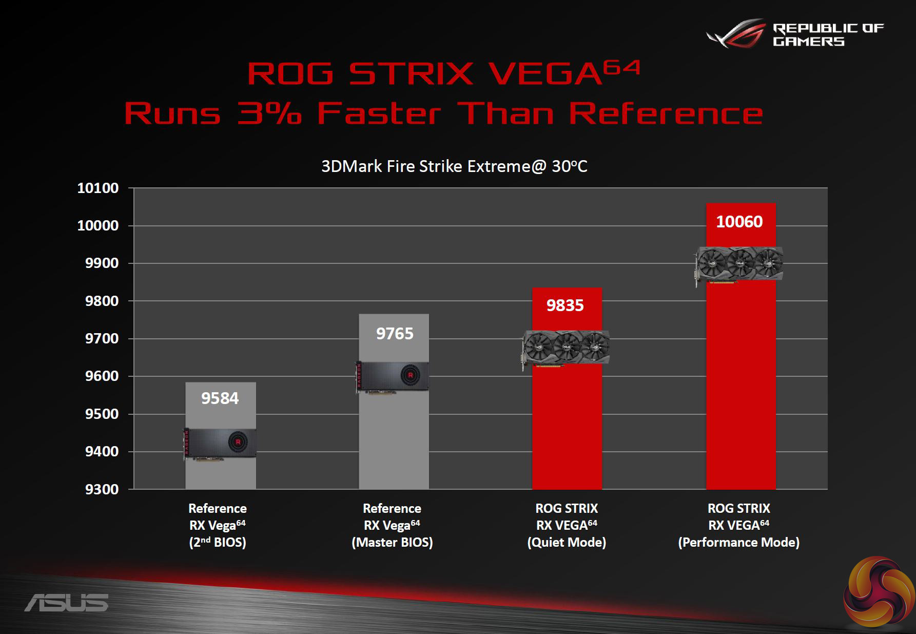 Naturally, we wanted to see how well ROG Strix RX Vega64 performed, so we were disappointed when we were told that clock speeds had not been finalised. Indeed, AMD was still releasing data to their AIB partners. Shortly before we arrived at the Asus office, they had been busy updating the BIOS of the ROG Strix RX Vega64 and claimed a performance increase of ten percent. From a BIOS update.