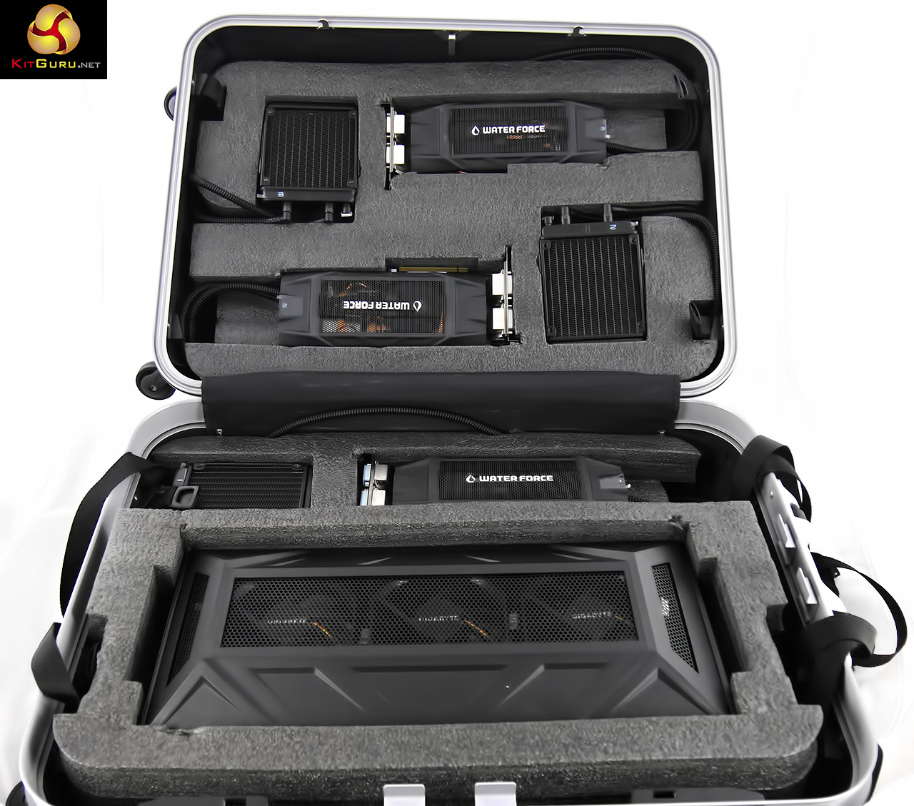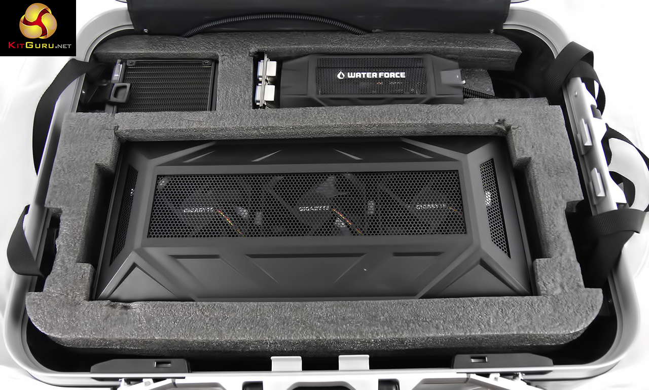 Every single aspect of the Gigabyte WaterForce graphics system is epic. Inside the wheeled suitcase (yes, really) you'll find three water cooled GTX 980 graphics cards, an aluminium casing that sits on top of your PC case to accommodate the three radiators and a handful of accessories. The idea behind WaterForce is that 4K gaming requires multiple high end graphics cards, however installing a cluster of GTX 980s will give you problems with heat build-up. After all, the 600W+ of power has to go somewhere and the middle graphics card is packed in tightly while the upper graphics card suffers from the physics that says ‘heat rises.'