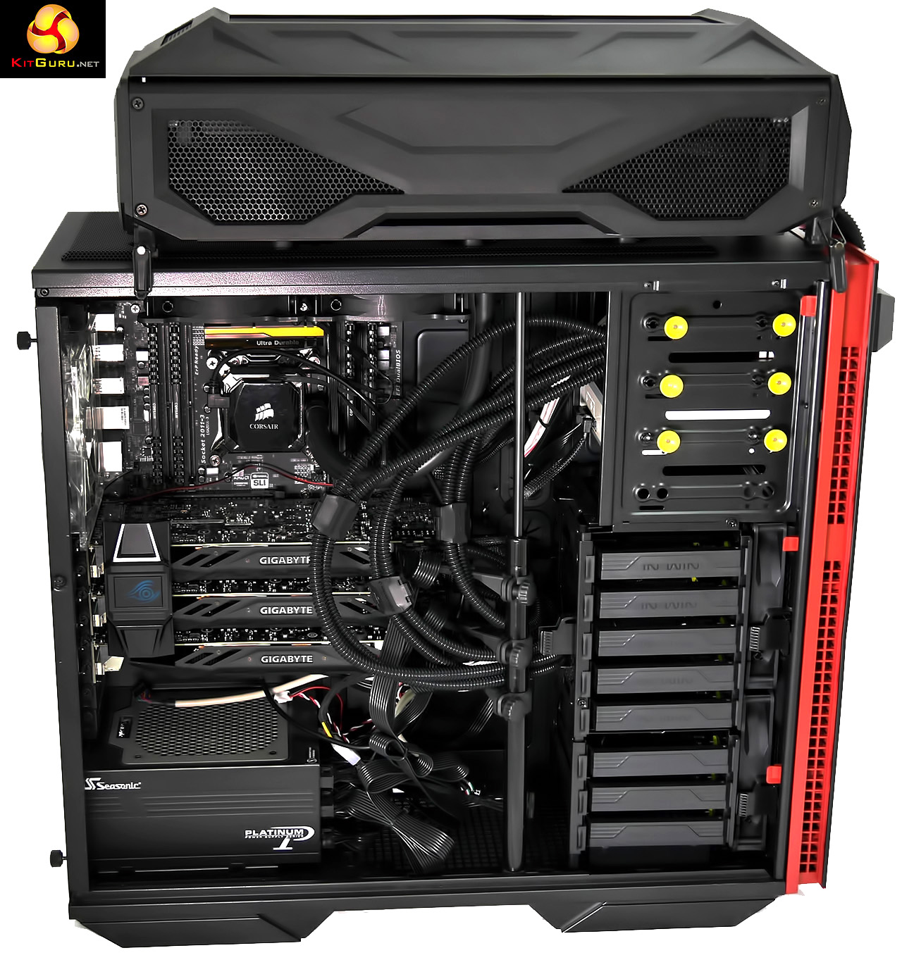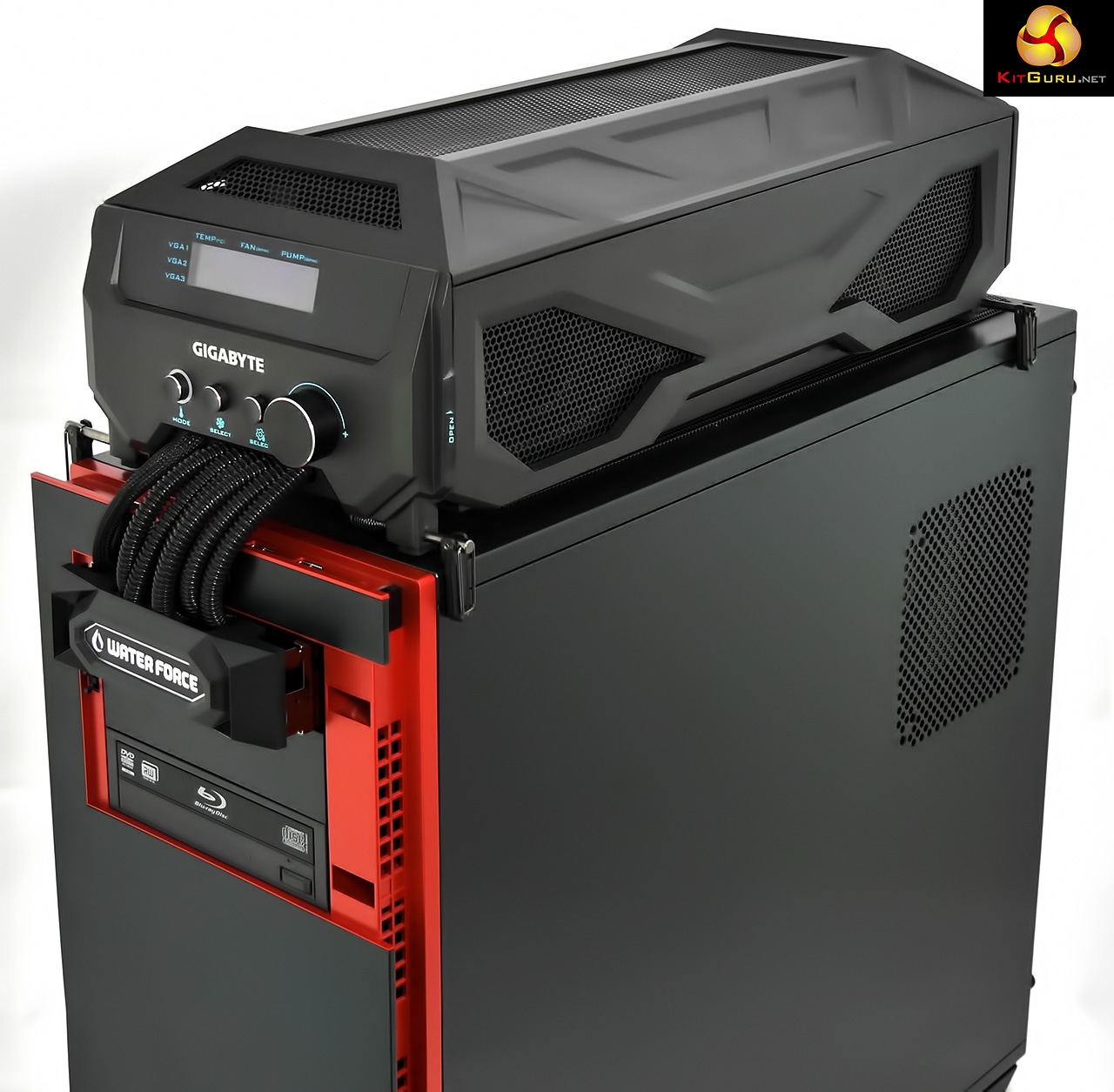 As you'll see in our video each graphics card is installed in the usual way and the individual 120mm radiators and their hoses are fed out through a 5.25-inch optical drive bay to the housing that sits on top of your case. The housing, or WaterBox, contains the cooling fans and has a set of controls on the front along with an LCD display.